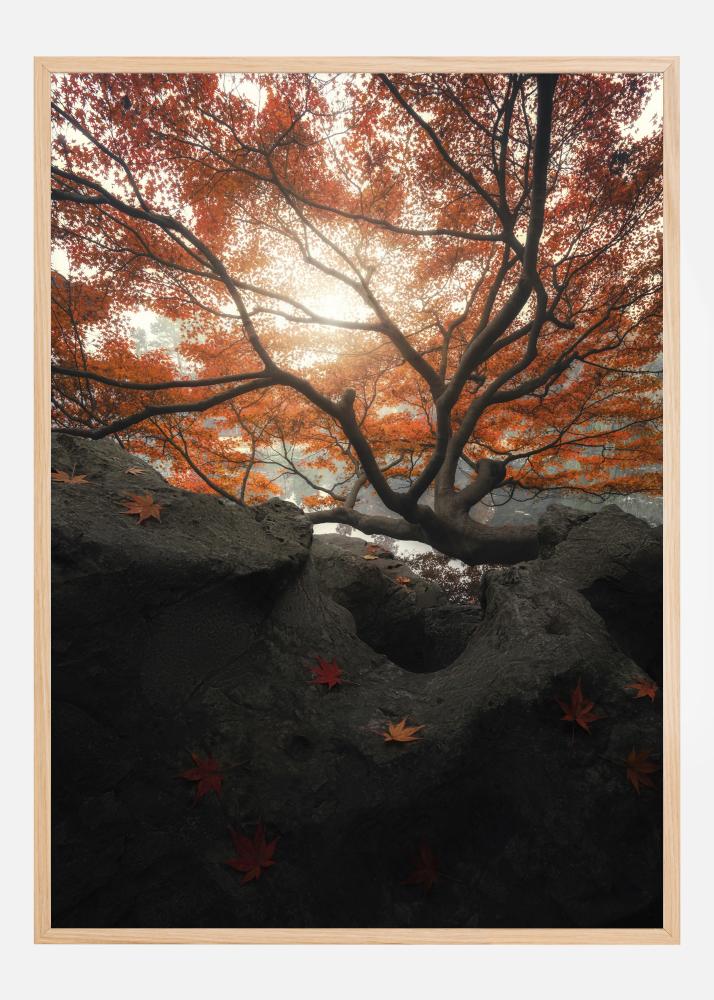 Hingemattev looduseposter kauni oranžika vahtrapuuga. Pildistatud konnavaates, ere päikesevalgus kiirgab läbi okste, luues sooja ja lõõgastava tunde. Esiplaanil on üksikud punased ja oranžid lehed langenud tüvele. Lisa oma koju väike osa loodusest selle trükisega.