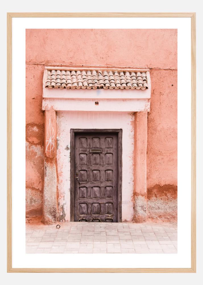 Kaunis virsiku- ja pruunikirju pruun puidust uks. Maroko maja on värvitud kaunis virsikukarva toonis. Ukse ümbritsev valge sein lisab portreele lisavalgust. Riputa see kaunis virsikukarva plakat beežile seinale, et luua harmoonia tunne.