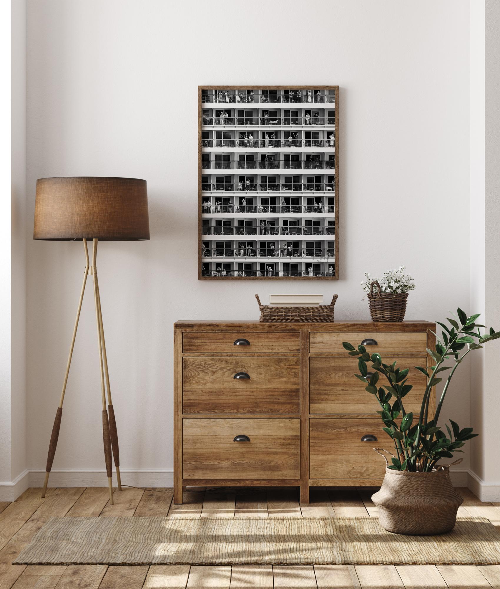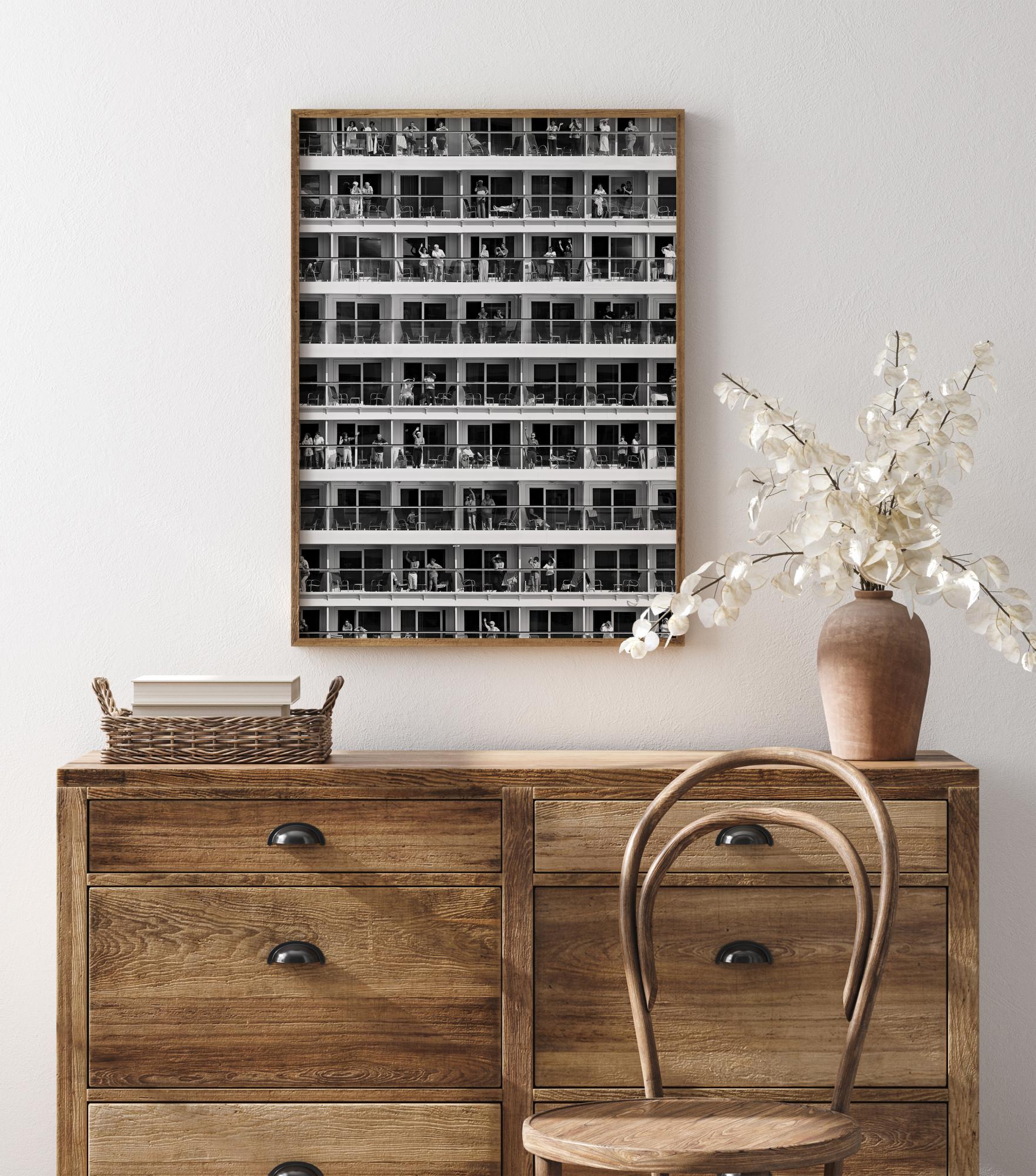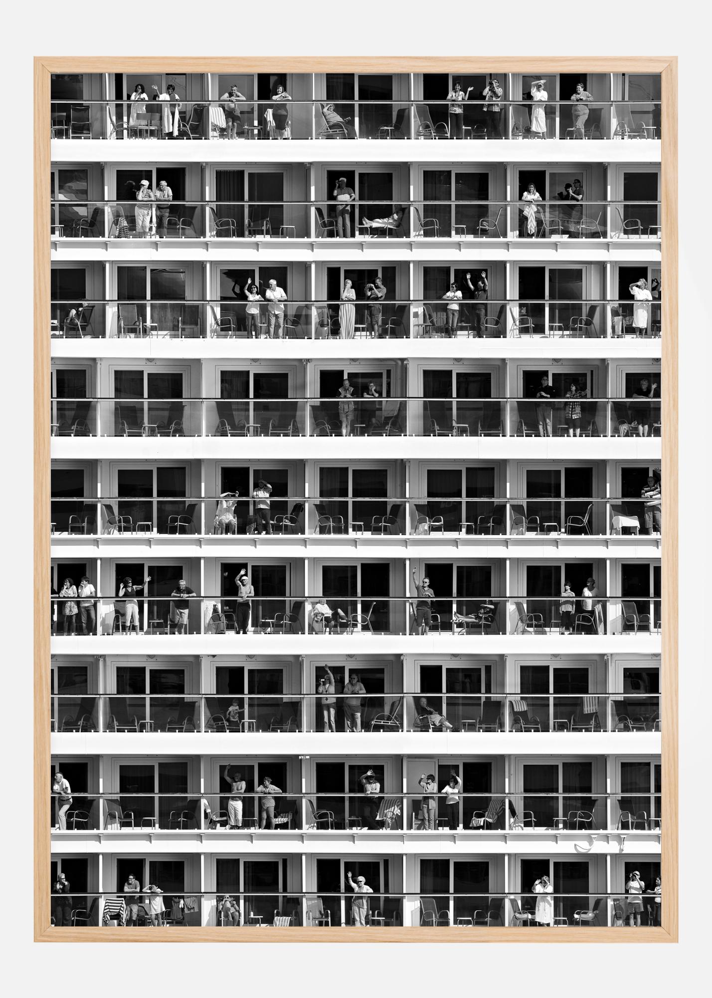 Geomeetriline reisiplakat, millel on ridade kaupa rõdusid ja päikest nautivaid inimesi. Tunneta armastust, kui lehvitad vastu kõigile sõbralikele nägudele sellel kujutlusvõimelisel turismipildil.