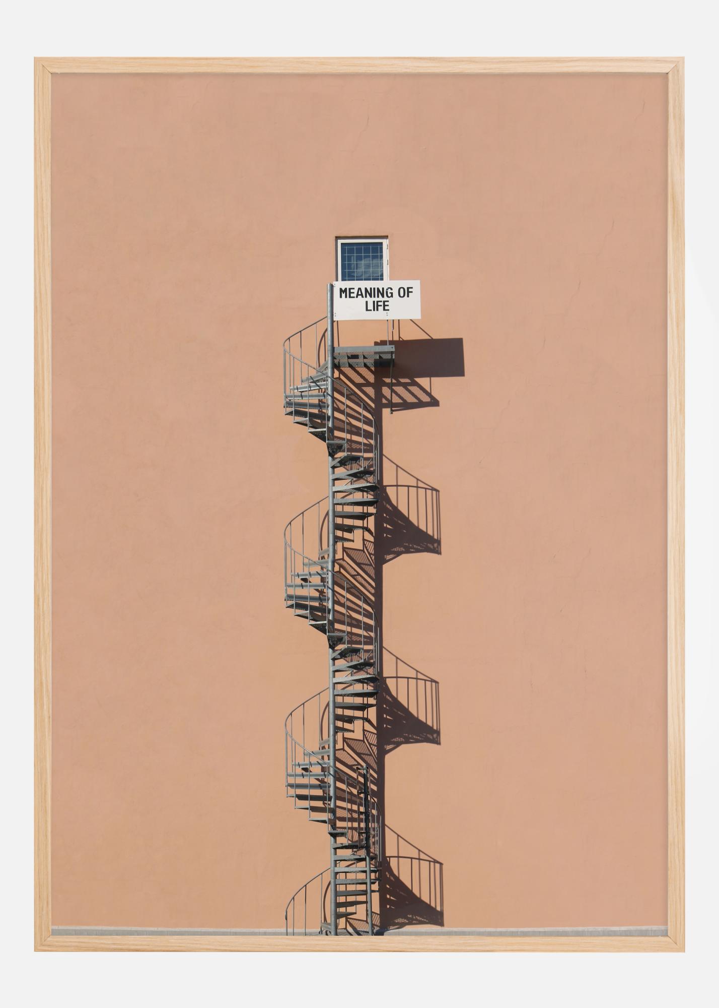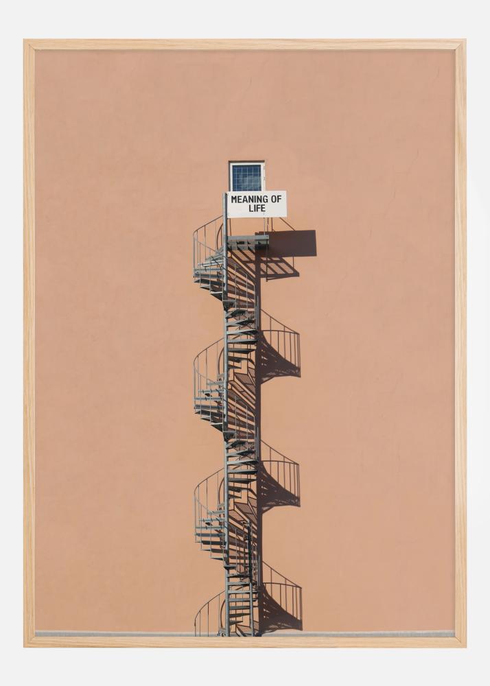 Vastandudes minimalistlikule, ühtlaselt värvitud taustale, paistab trepp silma kui struktuur, mis on nii füüsiline kui ka sümboolne, kus iga aste võib tähistada kogemust, õppimist või eluperioodi. Sildi paigutus tipus viitab sellele, et elu mõte võib olla midagi, mille poole me pidevalt püüdleme, kuid mida me võib-olla kunagi täielikult ei suuda haarata ega täielikult mõista.