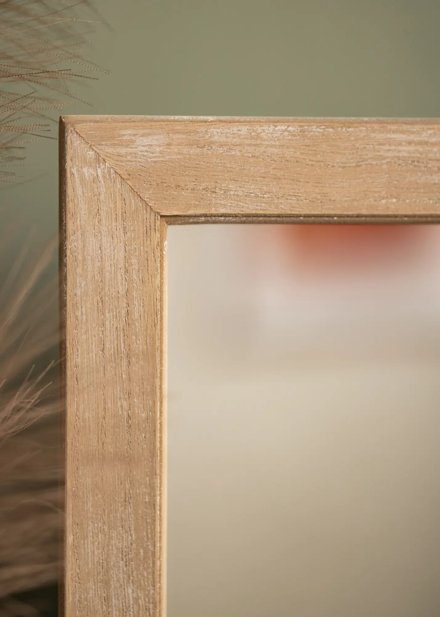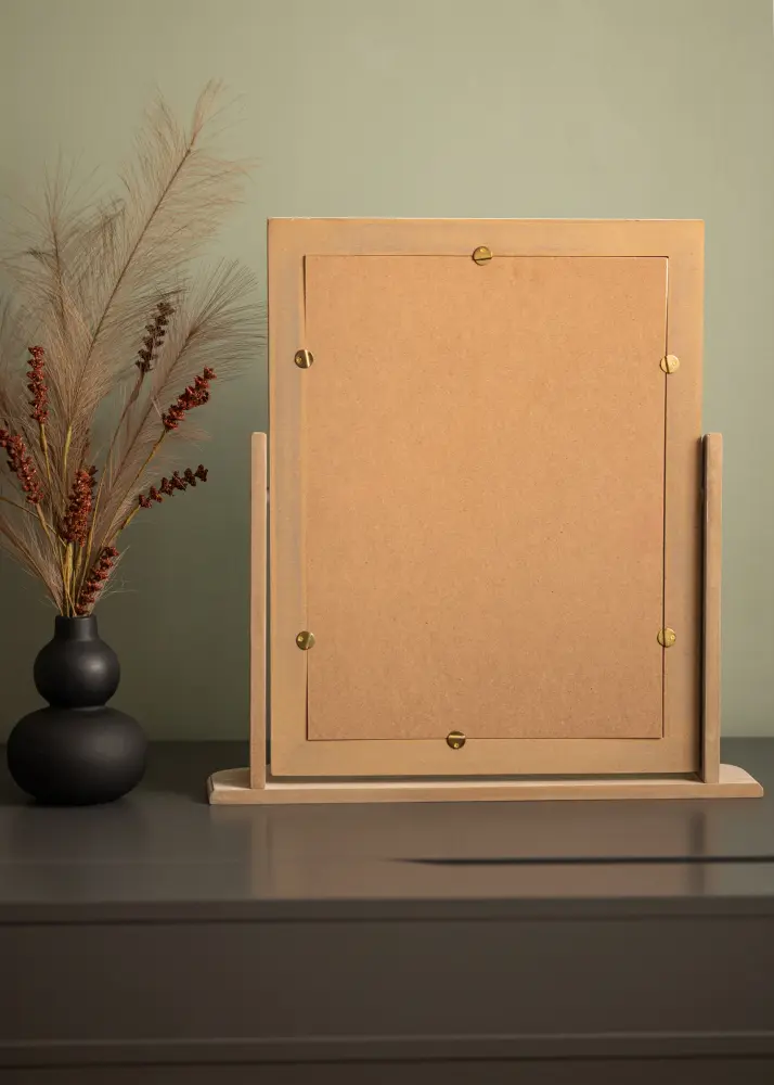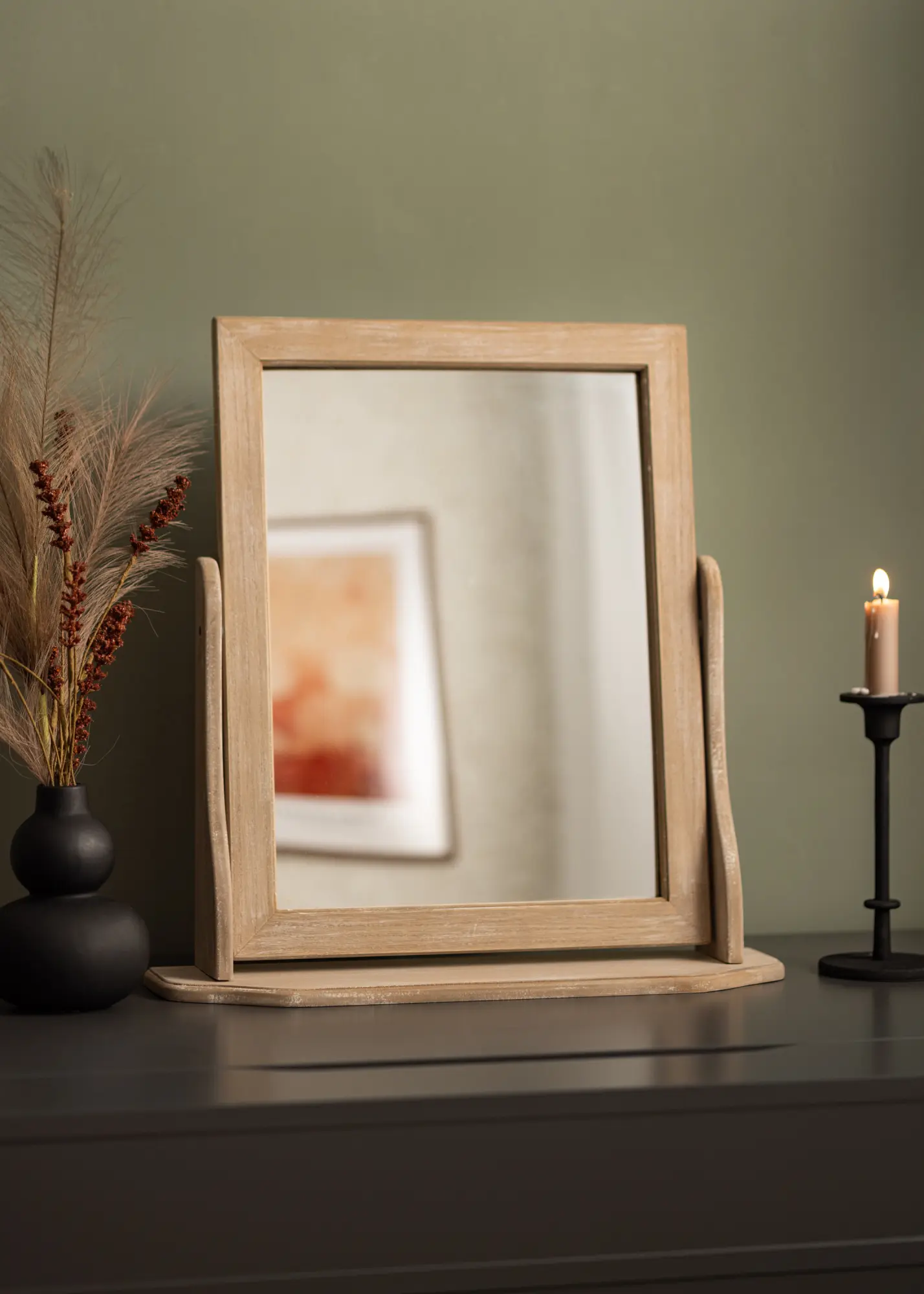 Peegel seisab kindlalt robustsel jalal, mis on mõeldud asetamiseks meigilauale või kummutile. Ristkülikukujuline vorm on klassikaline ja lisab ruumi pehme puudutuse, samal ajal kui selge peegeldus tagab, et sa näed end parimas võimalikus valguses.