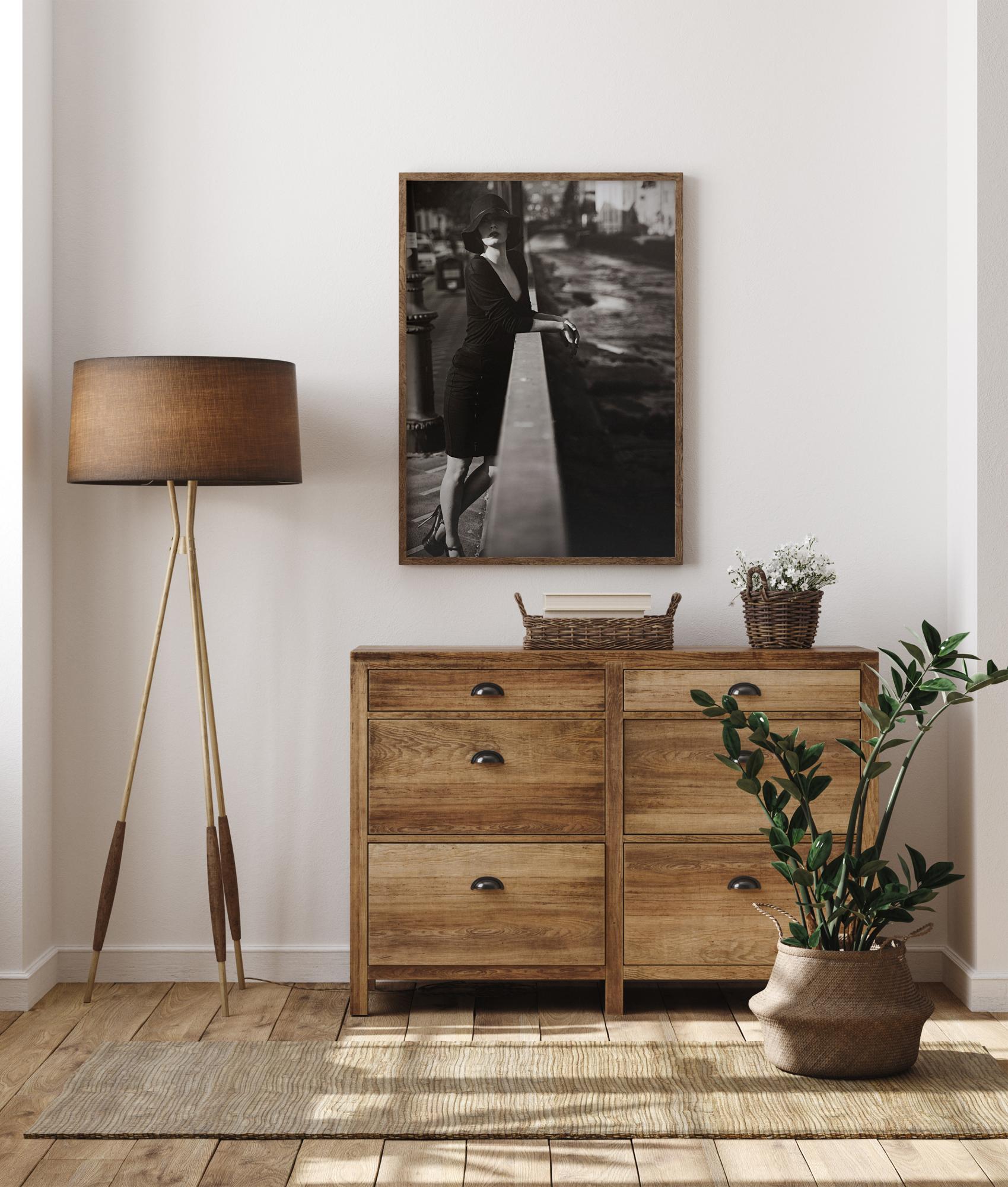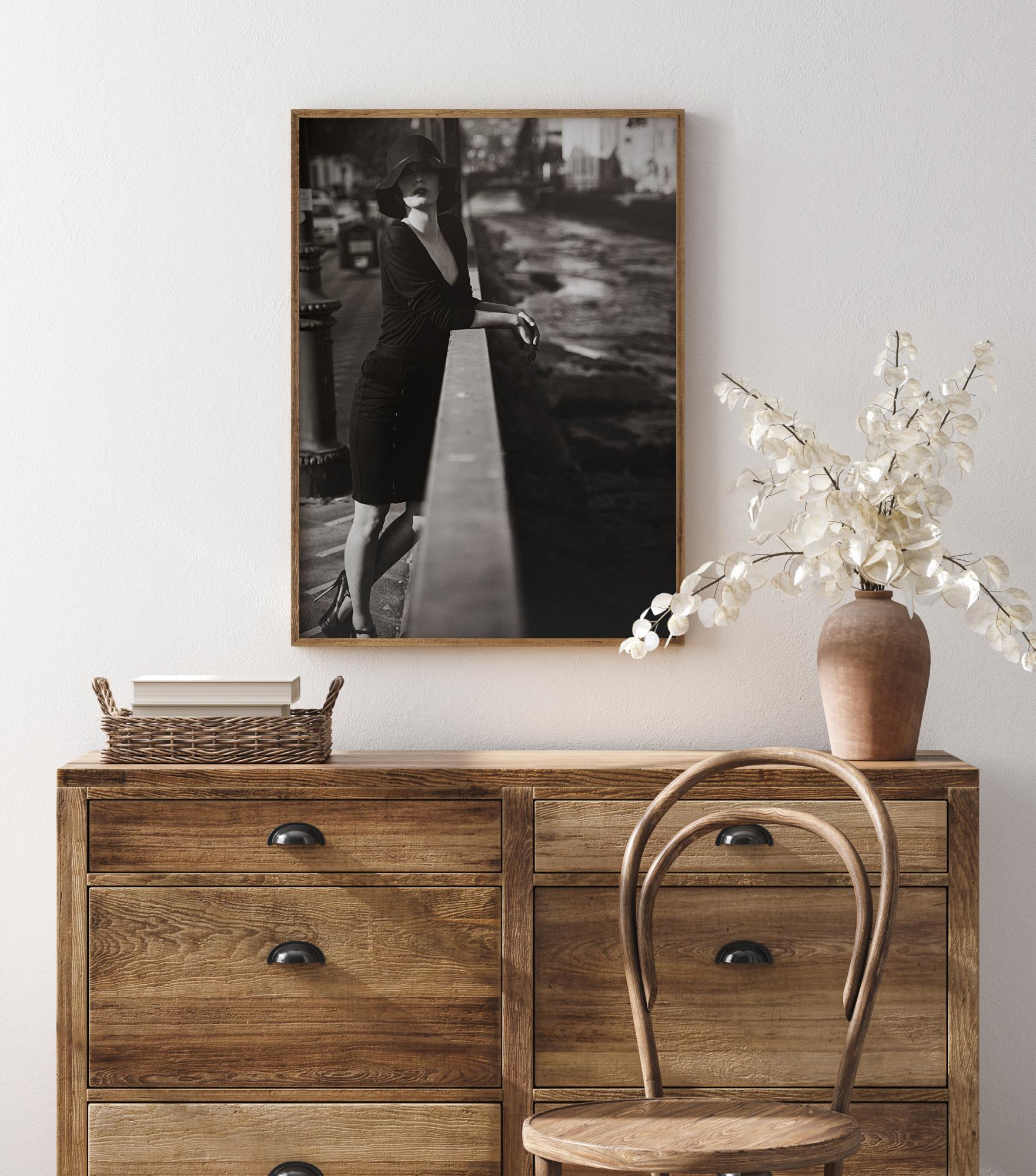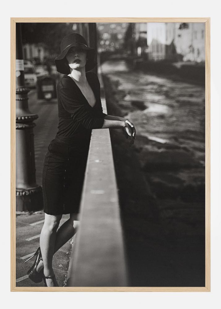Portree naisest, kes toetub seinale. See suurepärane foto kiirgab klassi ja püüab lõdvestunud elegantsi nagu mitte miski muu. Pane see plakat seinale, et saada mõnus 30ndate tunne.