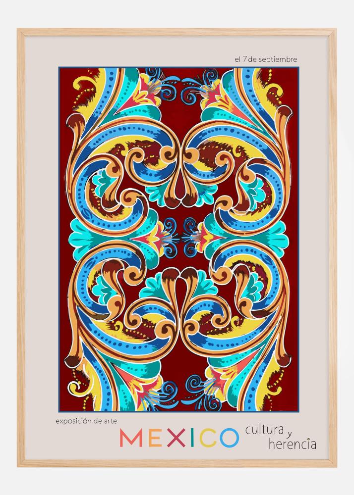See elav ja värvikas plakat tähistab kunstinäitust Mehhikos. Selle kujundus on inspireeritud traditsioonilistest Mehhiko mustritest, mis on täis keerdküünte ja lopsakaid lillemotiive, mis kutsuvad silma tantsima üle pildi. Rikkalikud punased, kollased ja sinised värvid on tüüpilised Mehhiko rahvakunstile ning sümboliseerivad rahva kultuuri ja pärandit kaasaegse pöördega.