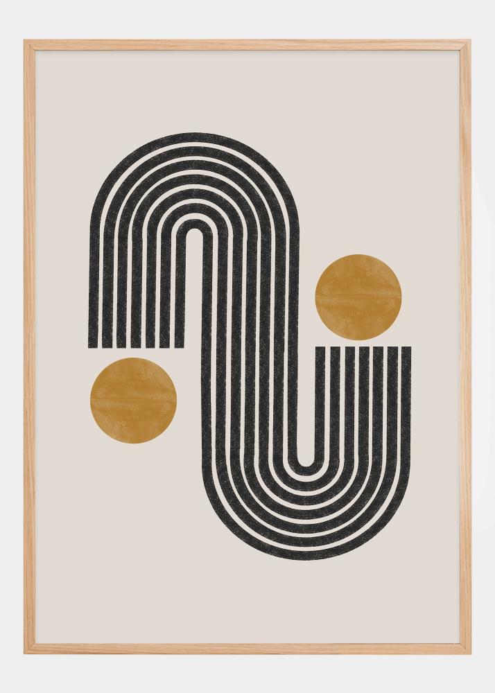 Avastage maailm stiilse iluga meie postriga, mis toob esile vastandeid nii vormi kui ka värvi kaudu. See trükk näitab dünaamilist mustvalget joonemustrit, mis moodustab pehme, kõverduva vormi, tasakaalustatuna kahe ookrikarva ringiga, mis loovad sooja ja maalähedase tunde. See minimalistlik, kuid tõhus disain on inspireeritud keskpaiga modernismist ja pakub rahu ja tasakaalu tunnet igas ruumis, kuhu see paigutatakse.