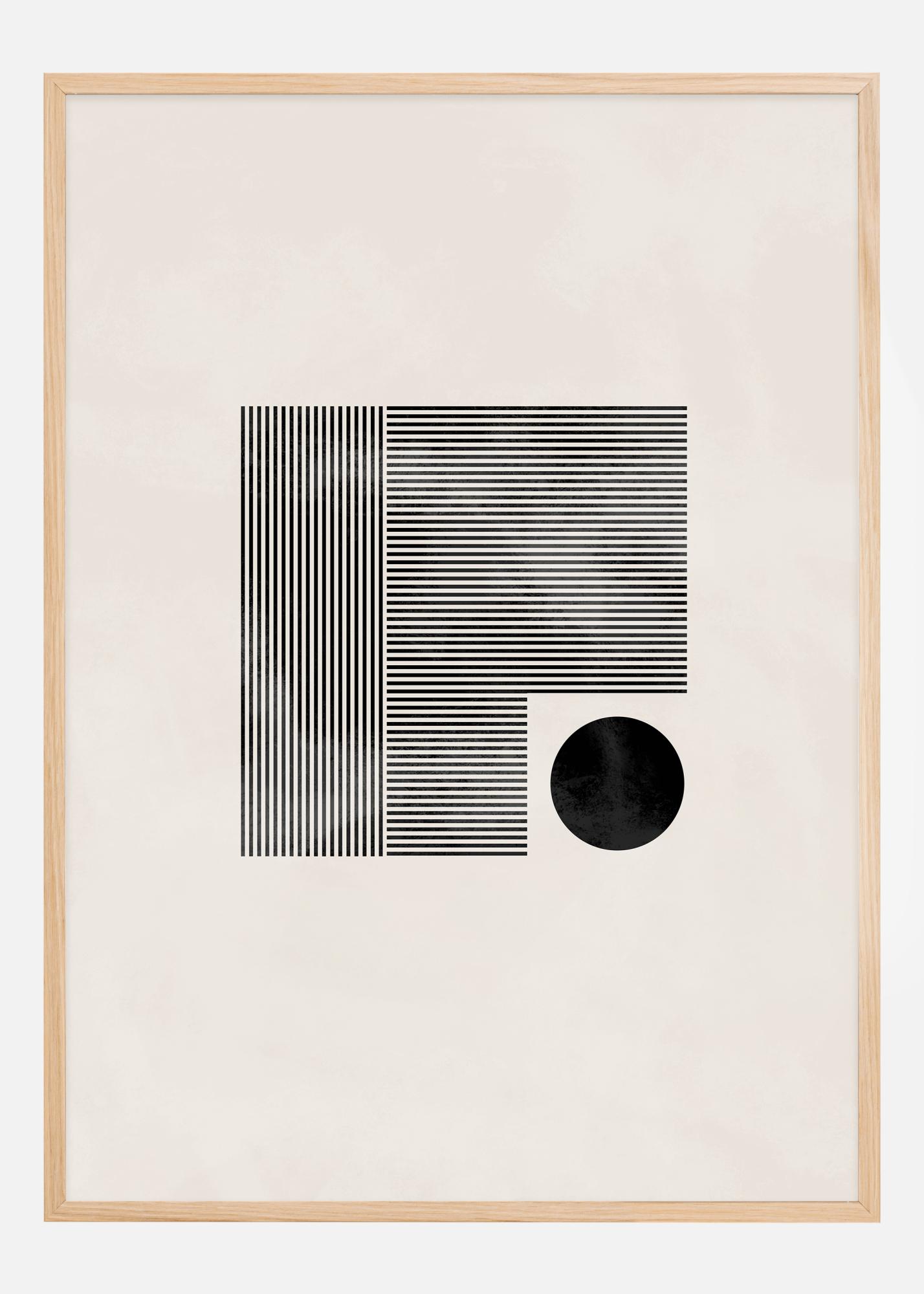 Selle stiilse ja minimalistliku plakati kujutamisel mängivad geomeetrilised kujundid, milleks on ristkülikud ja ring, kõik kujutatud julgetes mustades joonedes ja vormides pehme, kreemika tausta vastu. Ristkülikute joonte range kompositsioon annab korra ja struktuuri tunde, samas kui üksik must ring murrab rütmi ja toob sisse ebaregulaarsuse, mis loob visuaalset huvi ja tasakaalu. See on kunstiteos, mida saab hinnata selle lihtsuse ja võime eest täiendada paljusid sisustusstiile.