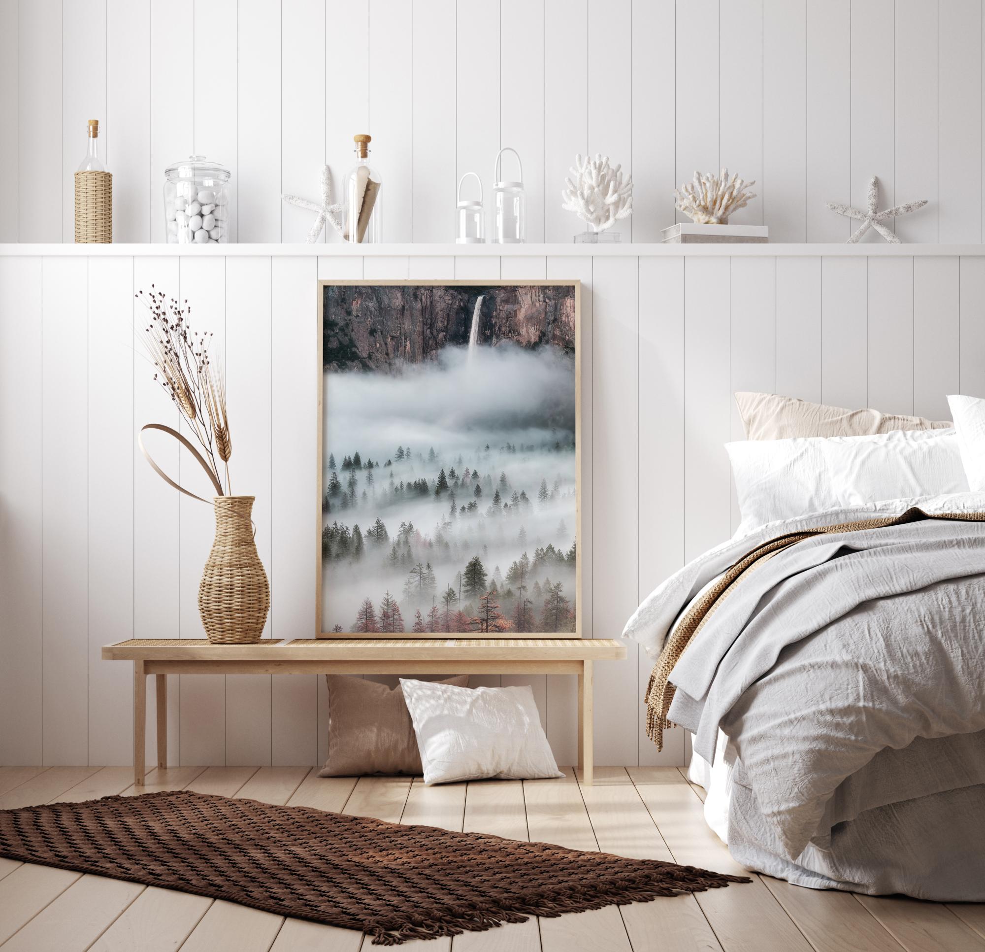 Imeline foto udusest mäeküljest mõne kiviga ja taustal muljetavaldav kosk. Pilvine udu hõljub rahulikult ja annab jaheda hommiku tunde, mis kaunistab teie kodu. Imelised sügisvärvid ja hõljuv udu annavad salapärase tunde.