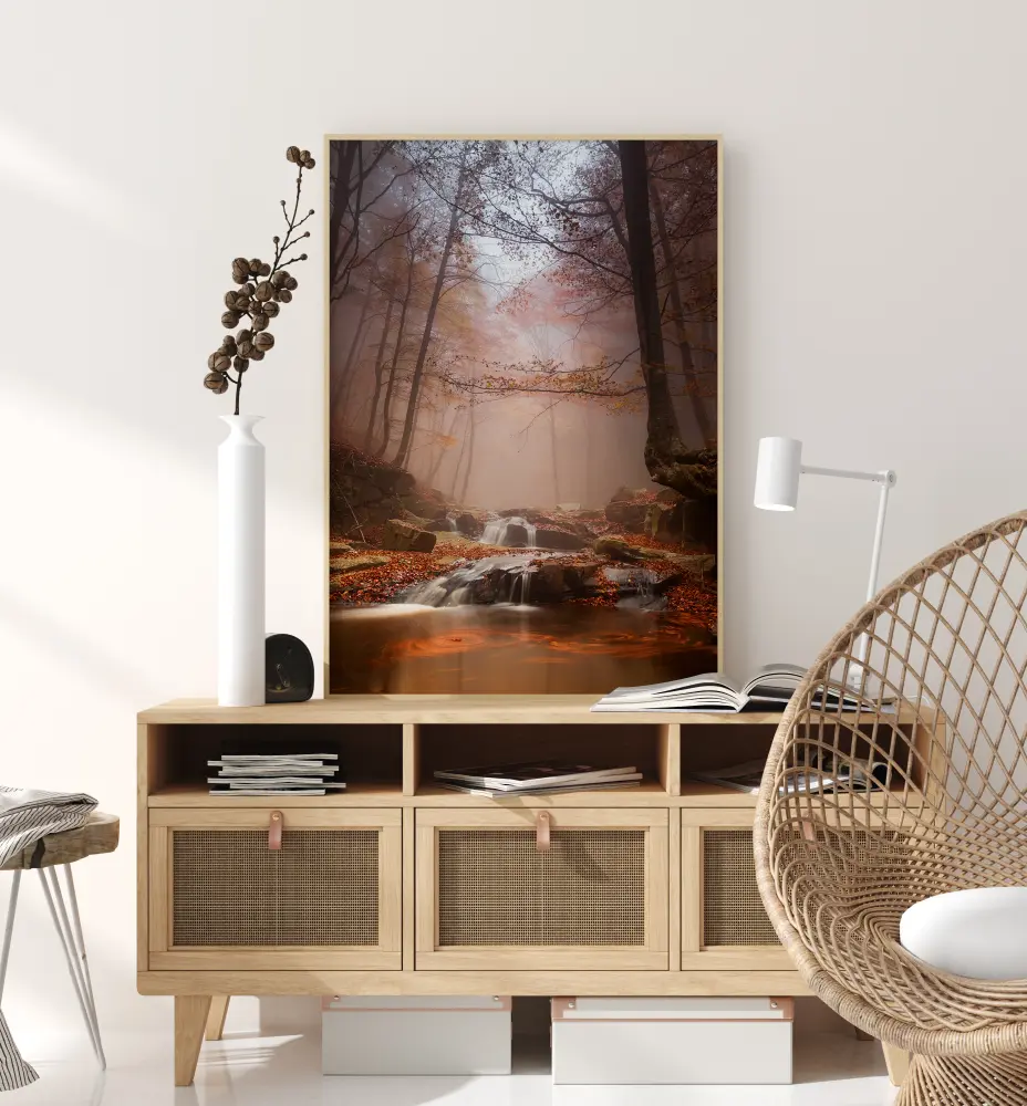 Looduskaunis portree udusest metsast kauni ojaga. Udu blokeerib otsese päikesevalguse ja ainult mõned kiired valgustavad uduse metsa, tuues esile pruunid ja kollased lehed. Esiotsas on sügiseselt värvunud lehed jõe kaldal. See plakat on valmis tooma teie koju looduskaunist ja kiviselt künklikku metsaülevaadet.
