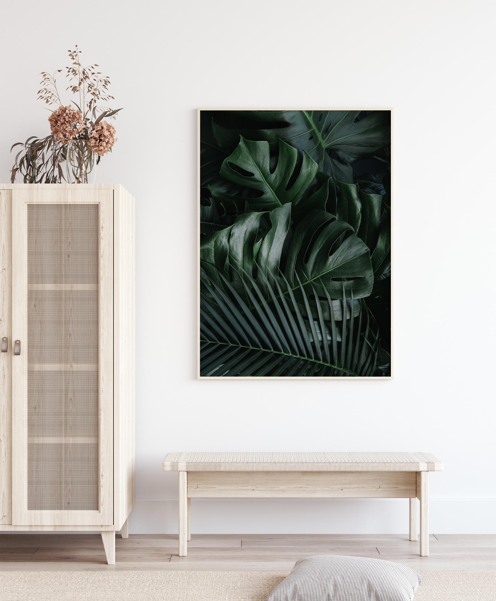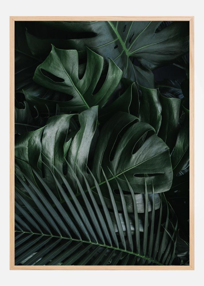 Rohelist Monstera ja palmi lehtedest koosnev lehemustriline portree. Looduslik valgus paistab ülemistele monstera-lehtedele ja loob trüki ülemisse ossa tumedamaid toone. Saehambalised lehed loovad sooja ja lõõgastava tunde. Täiuslik poster kõigile taimede armastajatele.