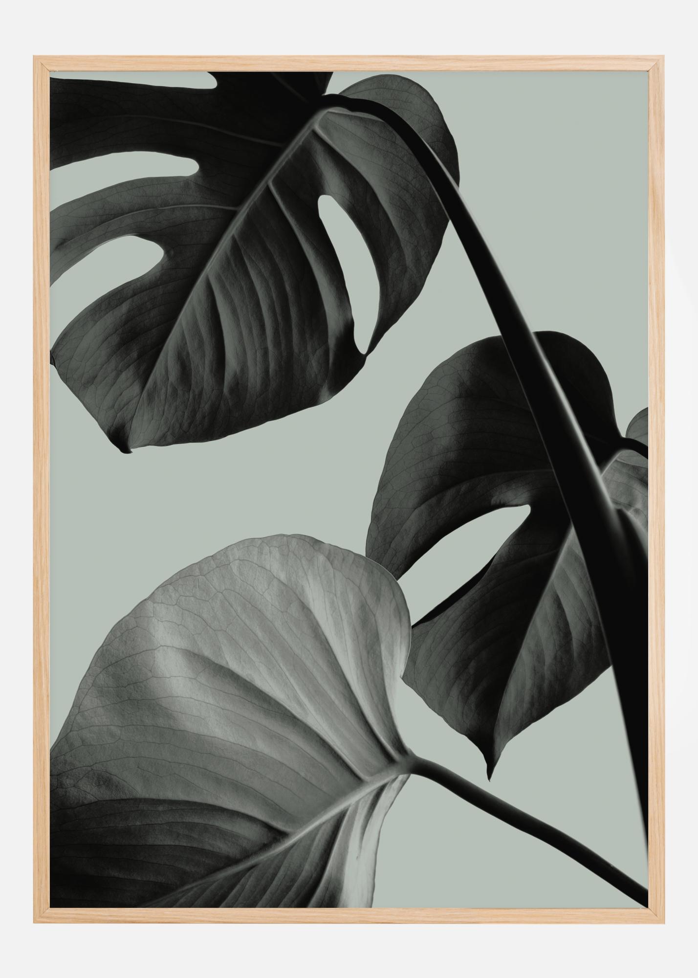 Imeline mustvalge lähivõtteposter kolme monstera-lehega, mille südamekujuline vorm ulatub mati halli tausta kohale. Saehambalised lehed on silmakujuliste vormidega, mis annavad neile ideaalselt metsiku tunde. Tooge oma koju põnev tunne, kuna need silmakujulised vormid on veidi hirmutavad.