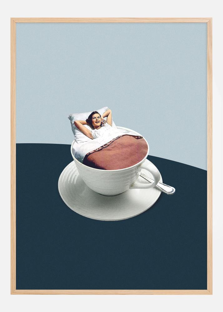See originaalne ja fantaasiarikas plakat kujutab naist, kes näib nautivat lõõgastavat hetke ebatavalisel viisil: ta lamab mugavalt valges tassis, mis on täidetud kohviga, ja on ümbritsetud rahustava sinise ruumiga, mis vihjab uue päeva koidikule. Tassi suurus naise suhtes loob sürrealistliku tunde ning tema lõõgastunud asend voodipesus lisab stseenile igapäevase mugavuse ja huumori puudutust.