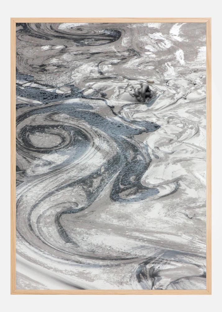 Jõevoolu muldpinna äge foto, mis moodustab šokolaadilaadse pinna. Pehmed mustad, beežid ja valged keerised sulanduvad täiuslikult kokku ja loovad fantaasiamustri. Ülima kaasaegse elutoa jaoks on see ideaalne poster, mida riputada beežile seinale.