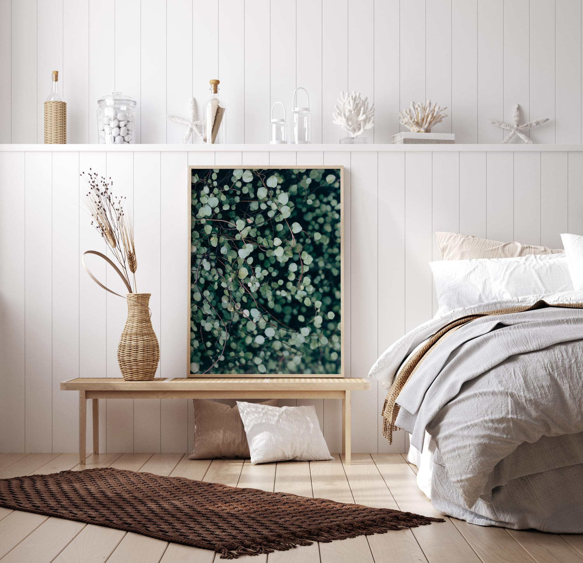 Kaunis roheline lähivõtepilt libliktaimest selle arvukate lehtede ja okstega. Väikesed ümmargused lehed säravad rõõmsalt päikesevalguses. Must taust toob lehed esile eriti hästi. Riputage see trükis heledale rohelisele seinale, et tekitada ruumis rahustav puudutus.