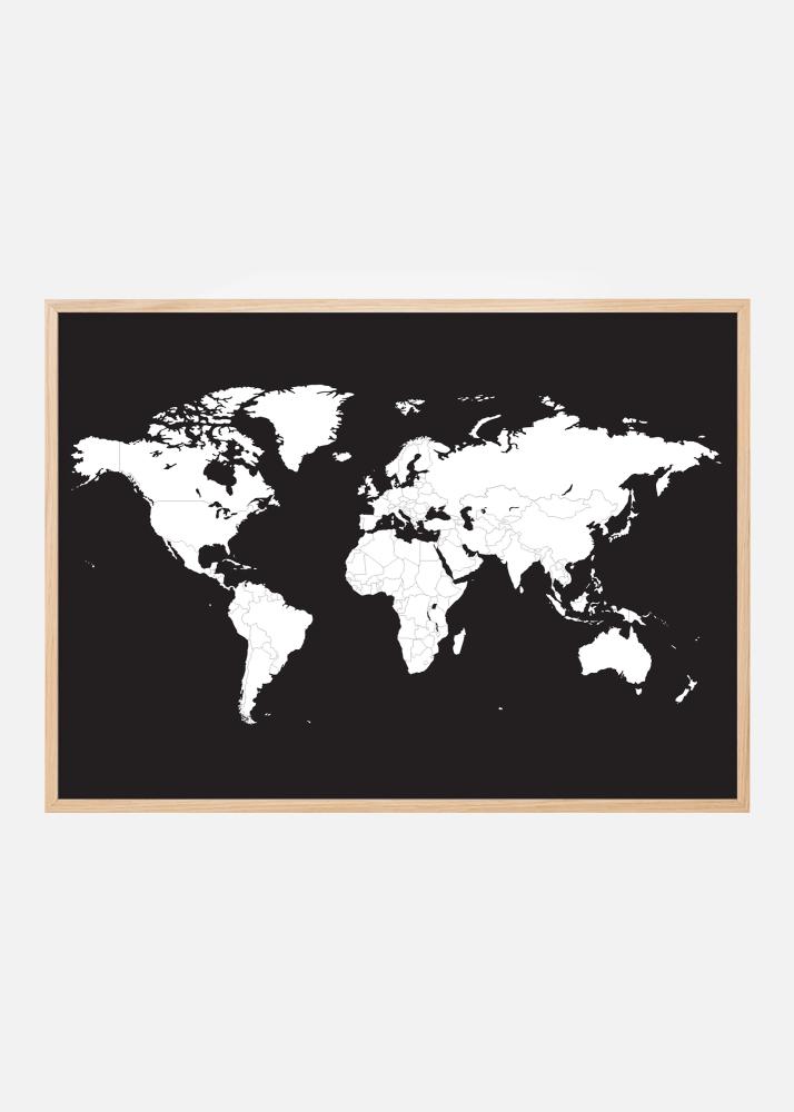 Maitsev graafiline trükk valgest maailmakaardist mustal taustal. Plakat tõmbab seinal pilku oma motiivi terava kontrastiga ning sobib hästi kasutada pildiseinal koos teiste graafiliste trükiste või mustvalgete piltidega tuntud reisisihtkohtadest. Raamige trükk pildiraamiga, mis sobib ruumi muu sisustusega, et luua terviklik tunne ja lasta pildil oma õigustesse jõuda.