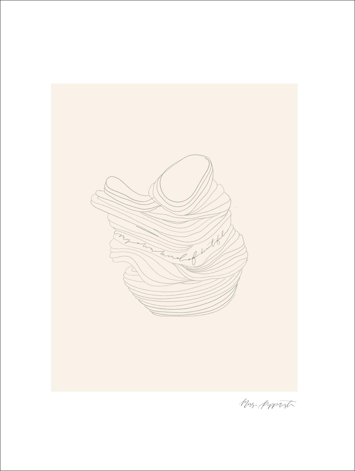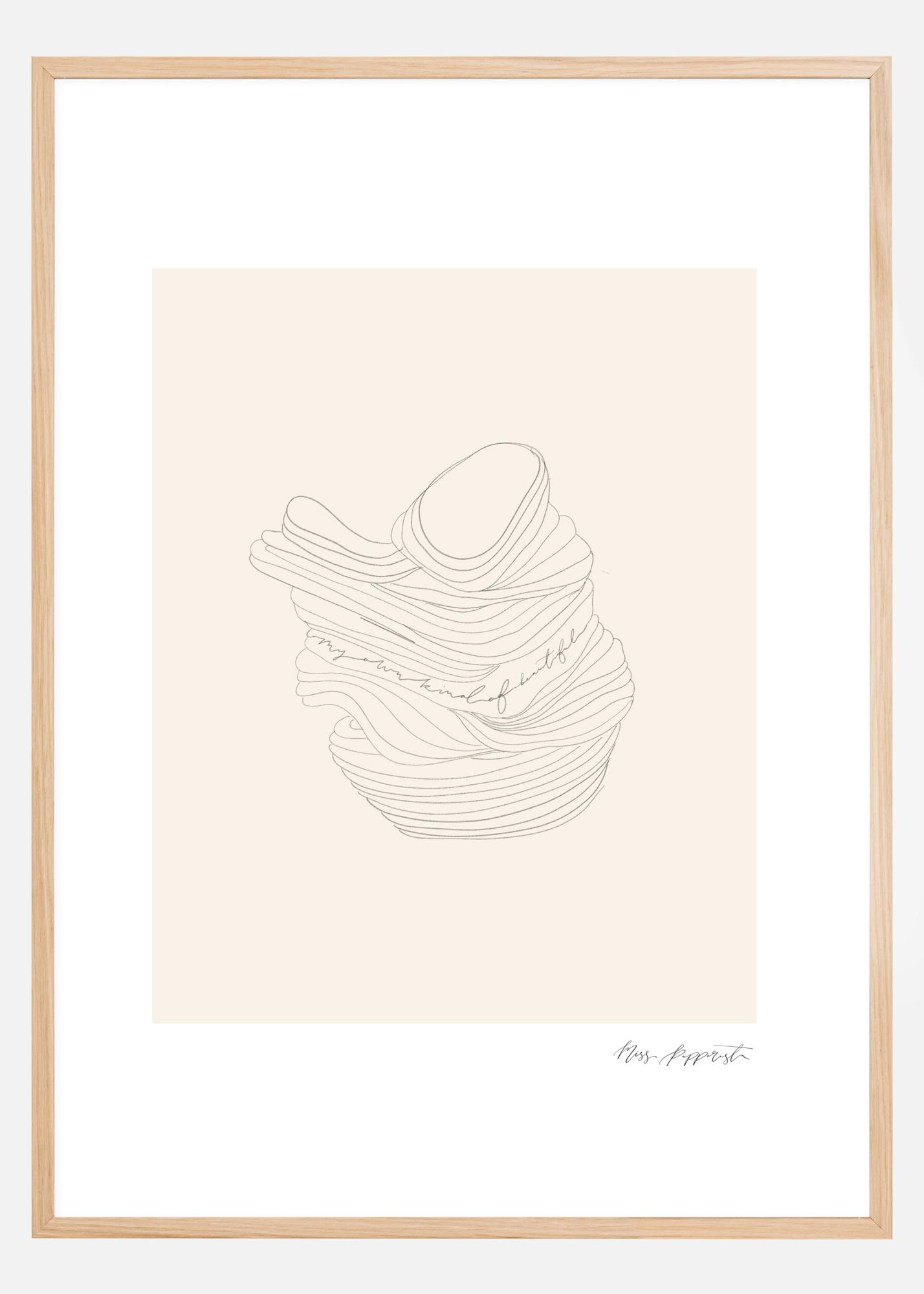 Huvitav joonistus virnastatud esemetest. Beež taust juhib pilgu pildil olevale ribitud kausile. Täiuslik trükk vestluse alustamiseks. Riputage see plakat oma elutuppa ja proovige välja mõelda, mis virnastatud esemed on.
