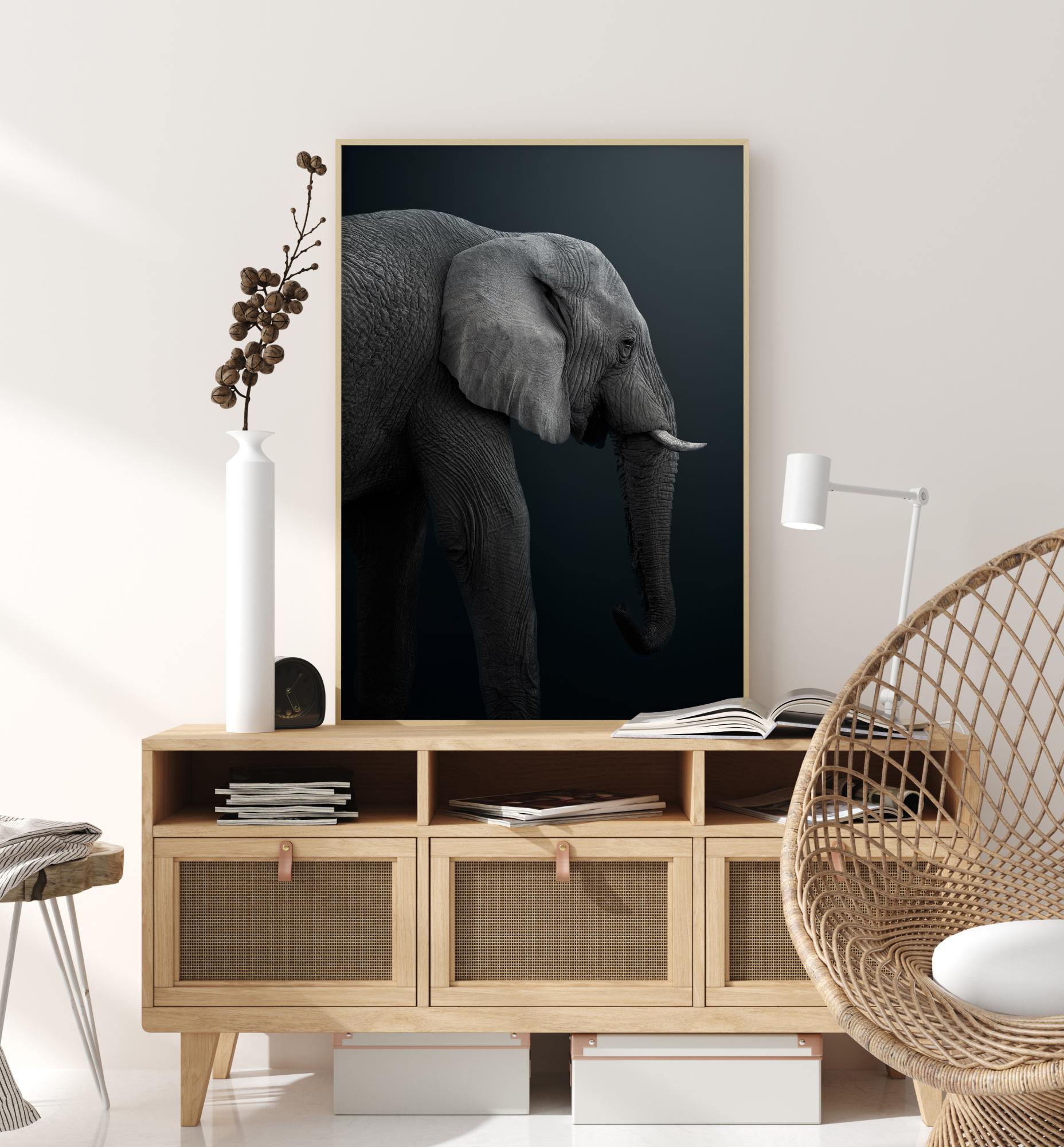 Võluv plakat uhke Namiibia elevandiga. Hall hiiglane seisab pildil paremale poole, lont rippumas. Tumesinine taust tekitab kurbuse tunde ja elevant näib väga üksik. See on ilus trükk kõigile elevandisõpradele.