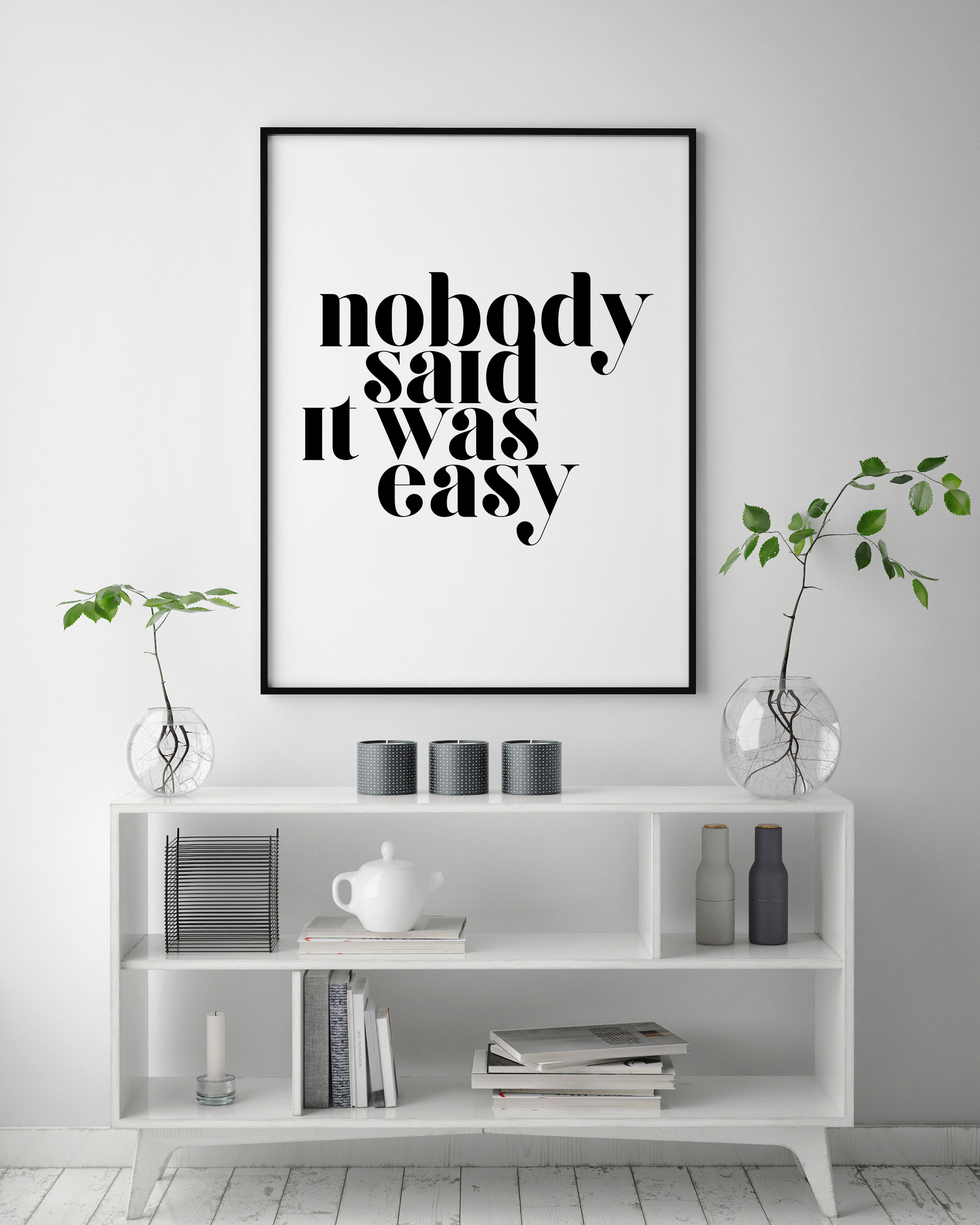 Trükitud plakat tsitaadiga "keegi ei öelnud, et see on lihtne". Valgel taustal on paks fraas kirjutatud musta kirjastiiliga. Lihtne, kuid tõhus julgustav sõnum. Täiuslik trükk riputamiseks töökeskkonda.