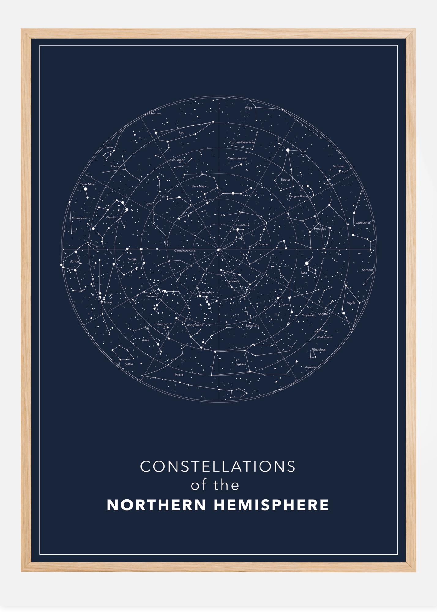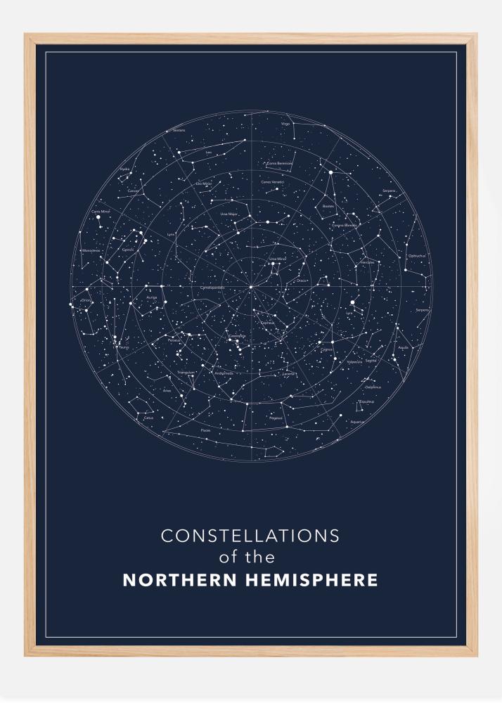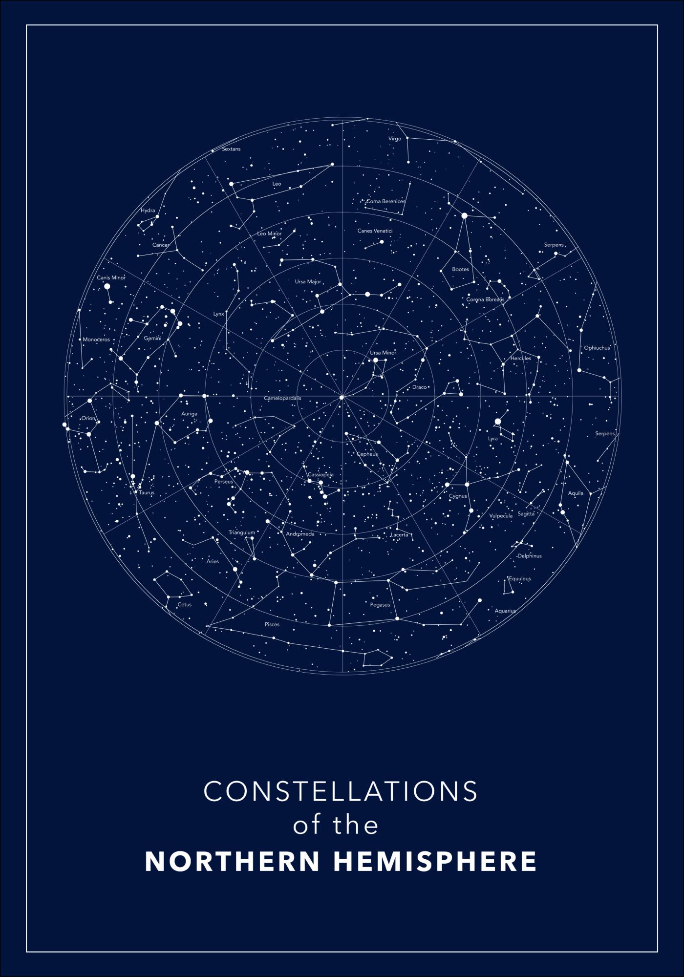 Särav poster valge ringiga, millel on põhjapoolkera tähtkujud. Tähtkujud on esile toodud nõrga valge joonega ning iga tähtkuju nimi on kirjutatud selle alla. Tumedasinisel taustal on see väga selge põhjapoolkera tähtkujudega tutvumine. See on ideaalne plakat, mida riputada lugemistoas.