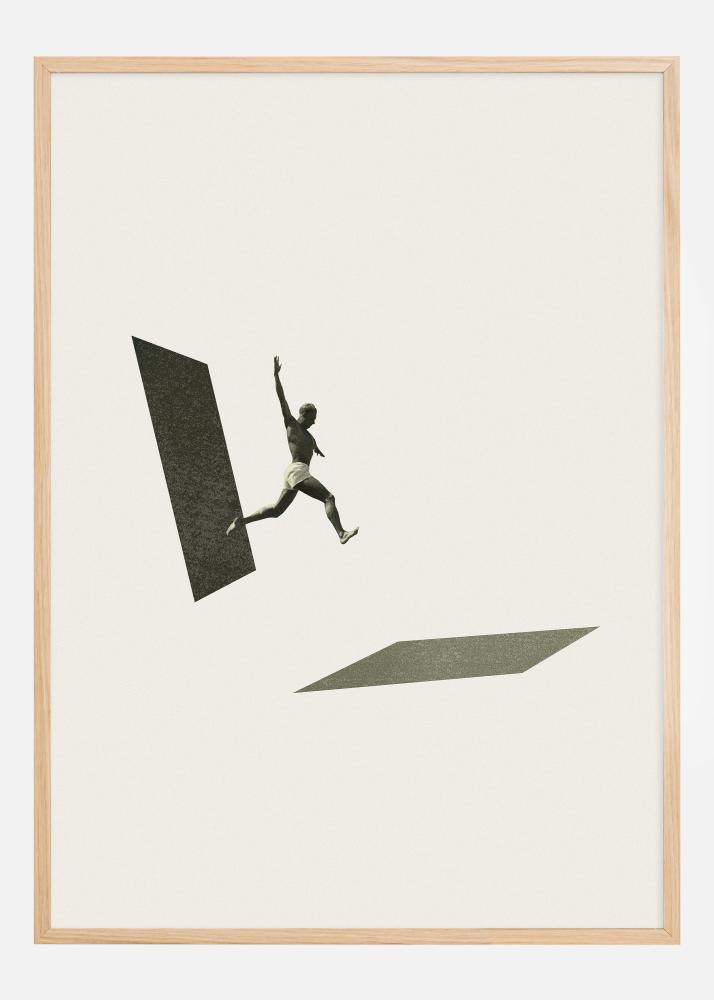 Selle köitev ja inspireeriv plakat kujutab inimest, kes hüppab avatud uksest ebakindlasse tulevikku, mida sümboliseerib varjutatud platvorm. Pilti võib tõlgendada kui metafoori julgusest astuda tundmatusse või mitte kõhelda uute väljakutsete ees. Inimese dünaamiline hoiak ja tugev hüpe illustreerivad otsustavuse ja edasipürgimise tunnet.