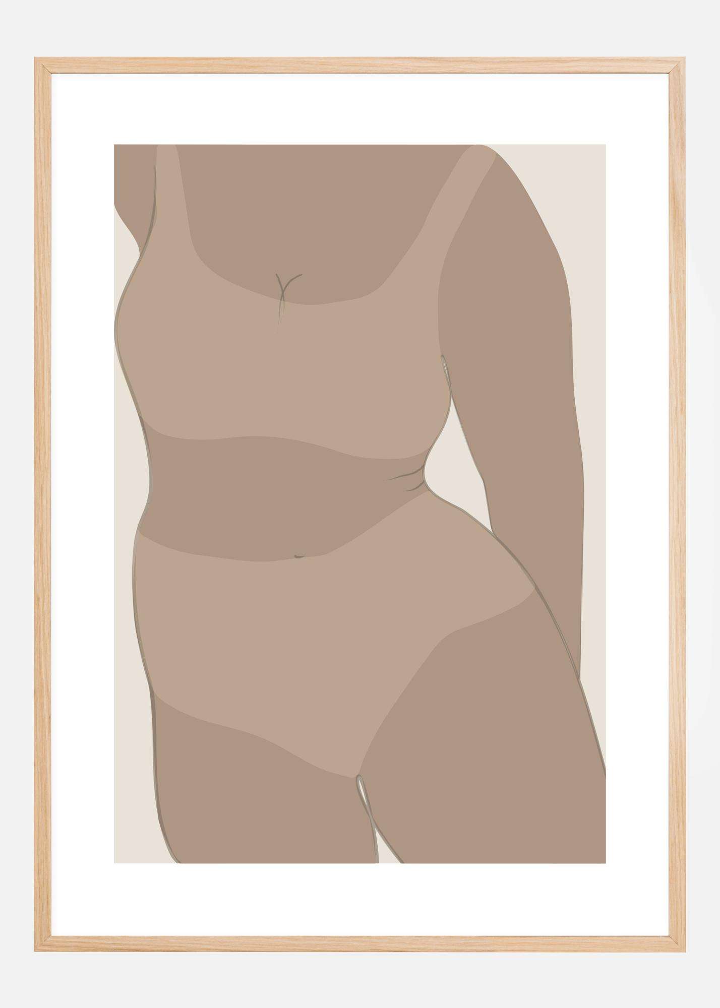 Beeži värvi plakat naisega tema aluspesus. Helebeežil taustal on näha heledaid pruunikaid kumerusi reitel ja väike vahe eraldab rindu. Lihtne trükis, mis näitab naise ilu aluspesus. Imesta selle naise ilu üle.