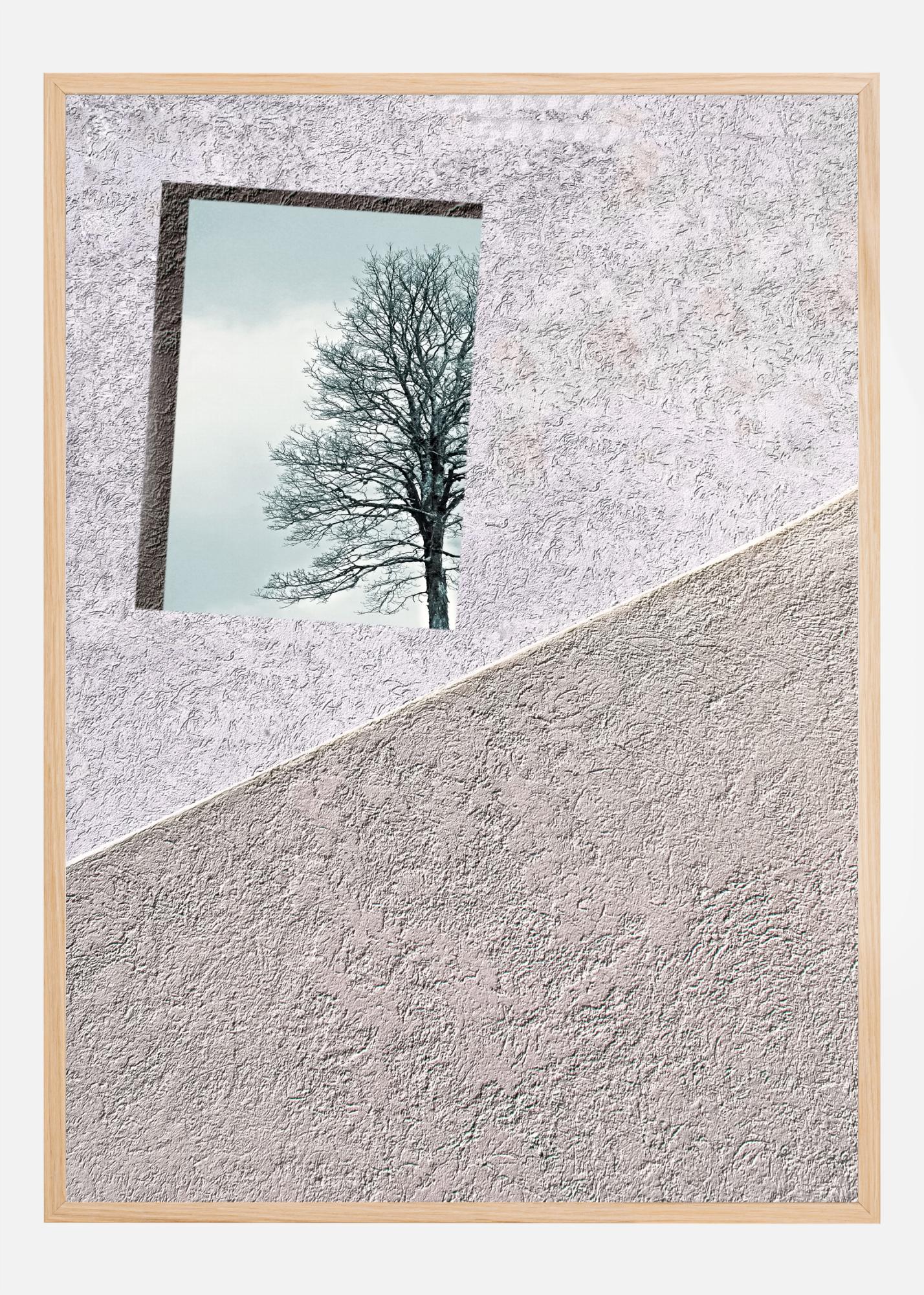 Õrn plakat roosal ja pruunil seinal. Krohvitud sein on jagatud kaheks osaks. Roosakal seinal võite näha kergelt pilves sinist taevast koos puuga esiplaanil, samal ajal kui pruun sein on paljas. Loominguline pilt iga moodsa kodu jaoks.