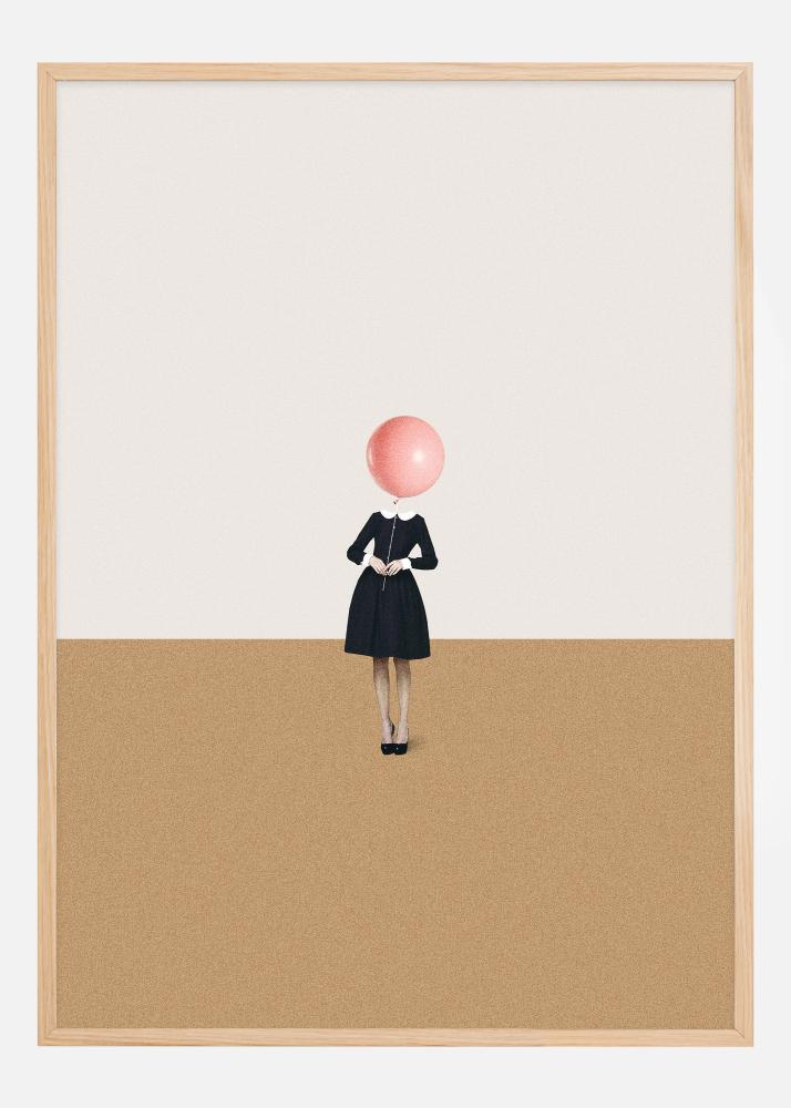 See kunstiposter köidab pilku oma lihtsa, kuid võimsa kujutisega naisest, kes seisab mustas kleidis üksinda sooja liivatoonide taustal. Ta hoiab pea kohal ideaalselt sfäärilise, roosa mullina paistvat eset, luues visuaalse ja mõtlemapaneva kontrasti inimese ja ümbritseva pinna vahel.