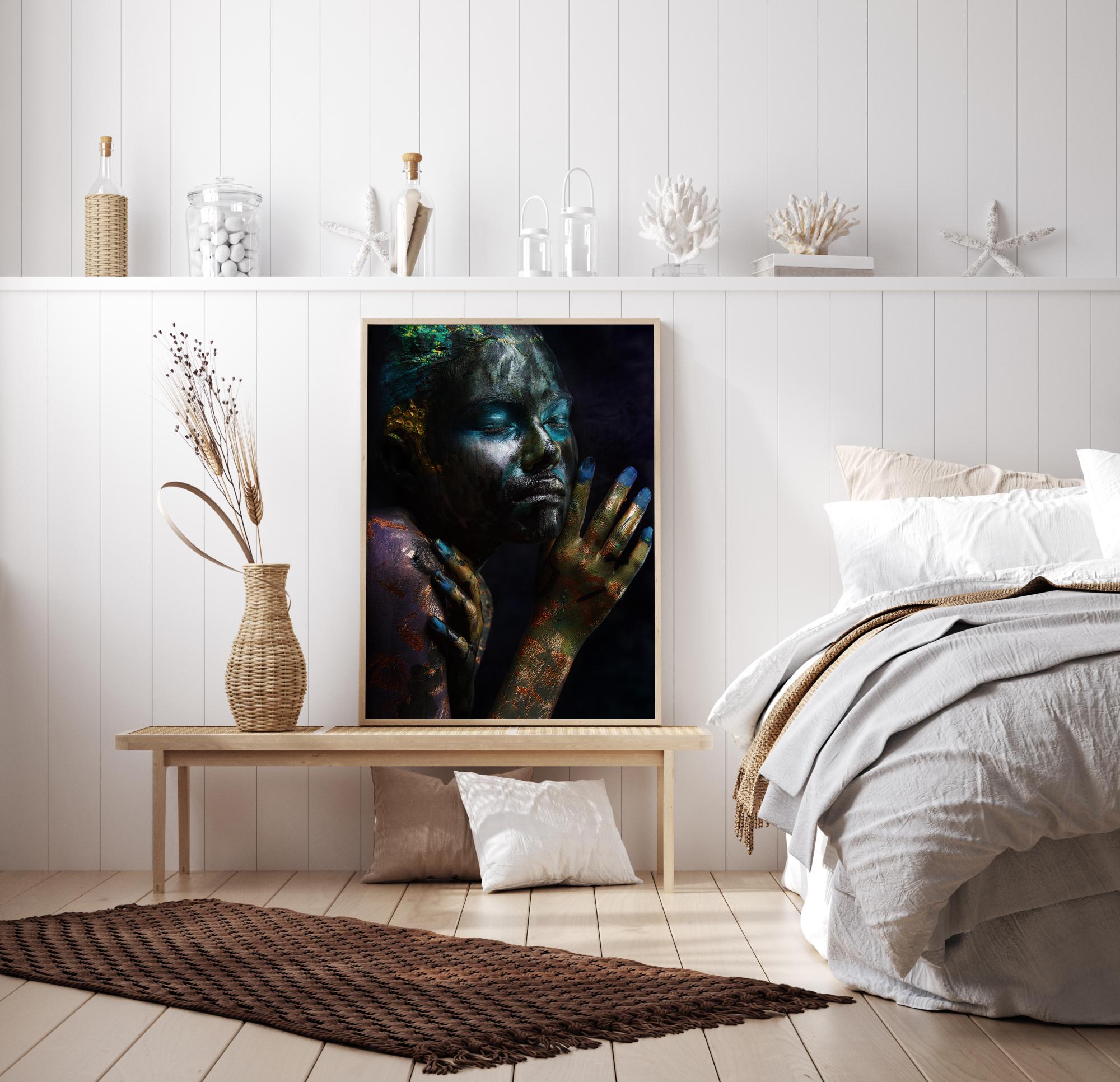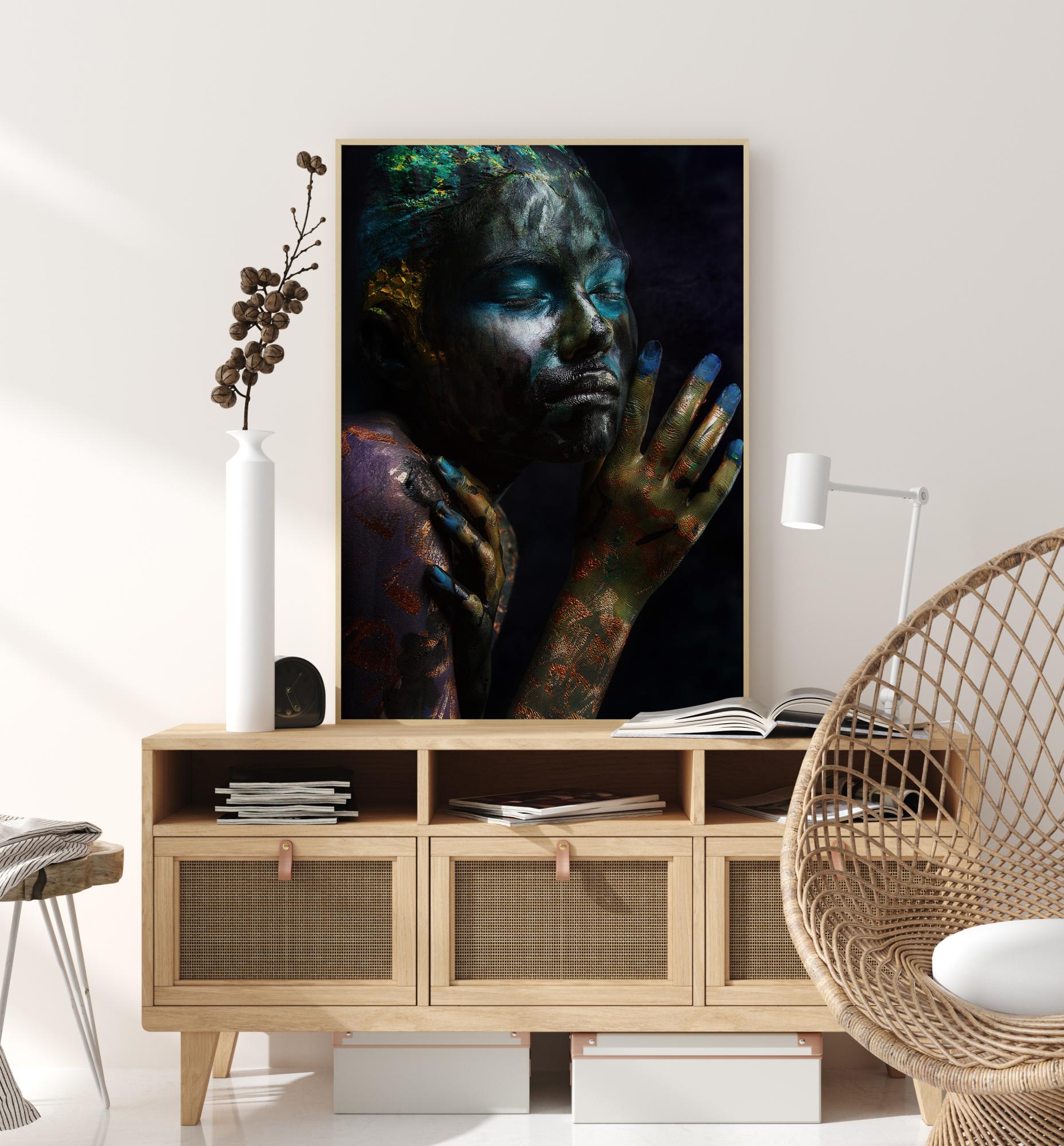 Hingemattev trükk naisest, kes on kaetud värviga. Mustal taustal on naine kaetud värvikirevate värvidega. Looduslik valgus, mis paistab naise näole ja õlgadele, toob esile värvide intensiivsuse. Kaunis poster, mis võib lisada värvi valgele seinale.