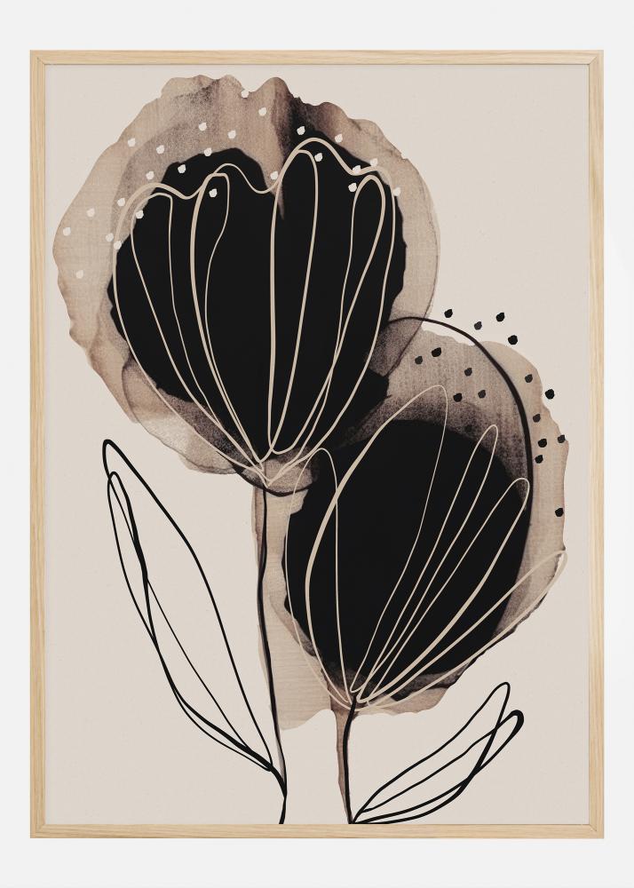 Uurige meie abstraktse lilleplakati dramaatilist ja kunstilist väljendust. See ainulaadne plakat toob esile tugeva elegantsi ja kontrasti tunde oma julgete mustade joontega, mis kujutavad lillede siluette. Abstraktne lilleteema on peenelt esitletud pehme seepiatooni ja beeži taustal, pakkudes sooja ja kutsuvat kontrasti tugevale mustale detailile.