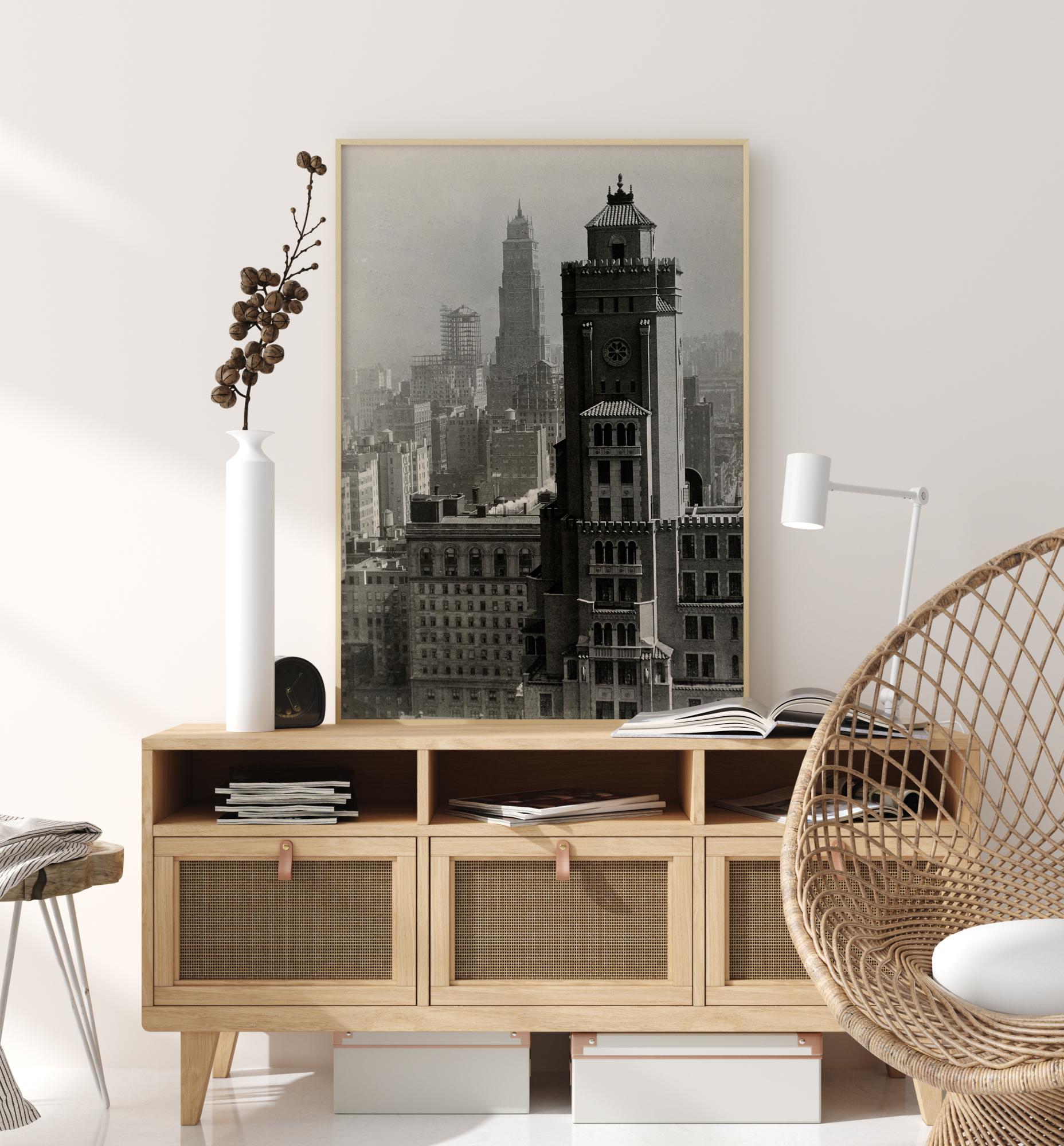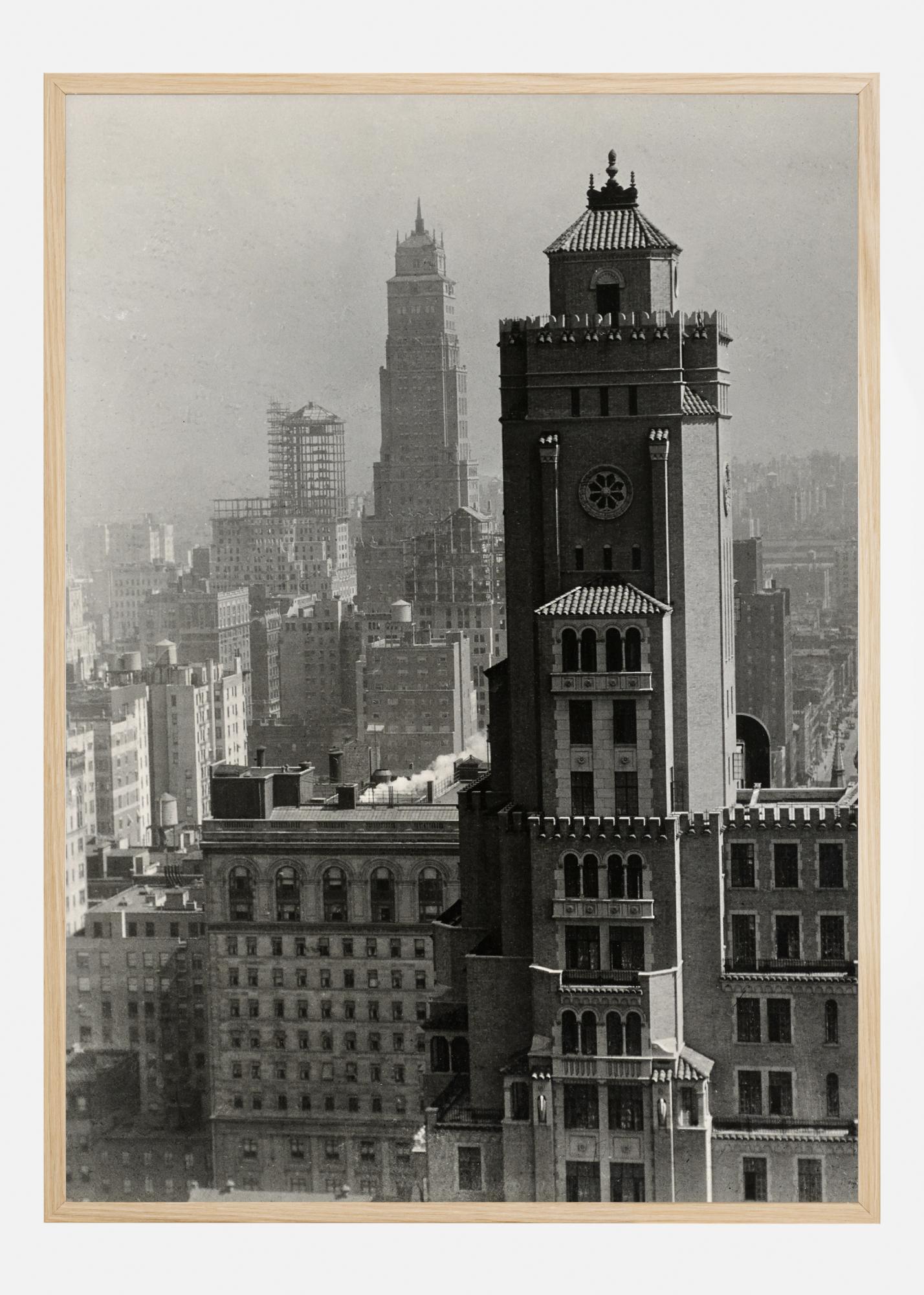 Mustvalge trükk vana linnaga. Hall linnajoon sulandub ideaalselt sama hallide hoonetega. Linn koosneb erineva kõrgusega hoonetest. Esiplaanil paistab loomulik valgus otse peahoone idaküljele. Riputa see poster oma tööruumi ja jälgi vana linna.