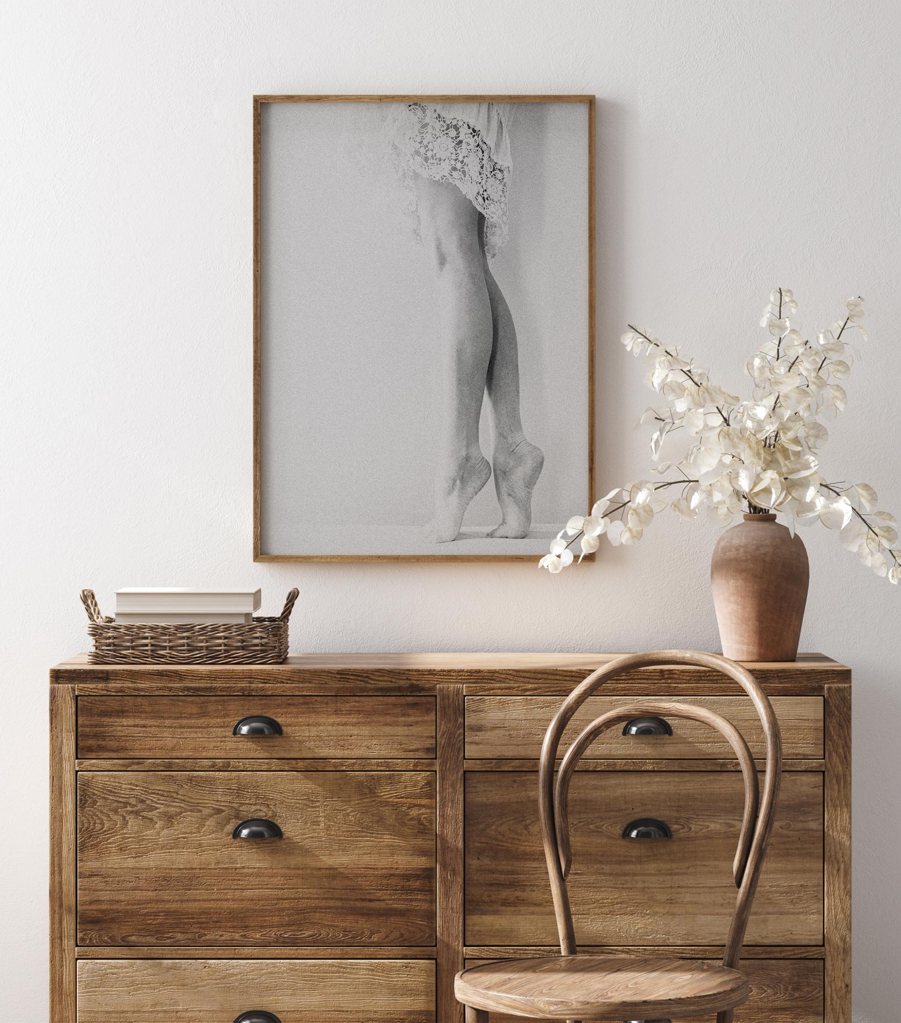 Elegantne poolportree naisest, kes seisab kikivarvul. Pildi lihtsus koos peene valge varjundiga teeb sellest suurepärase lisa teie magamistoale või elutoale.