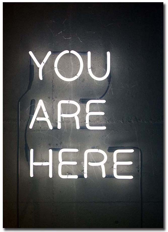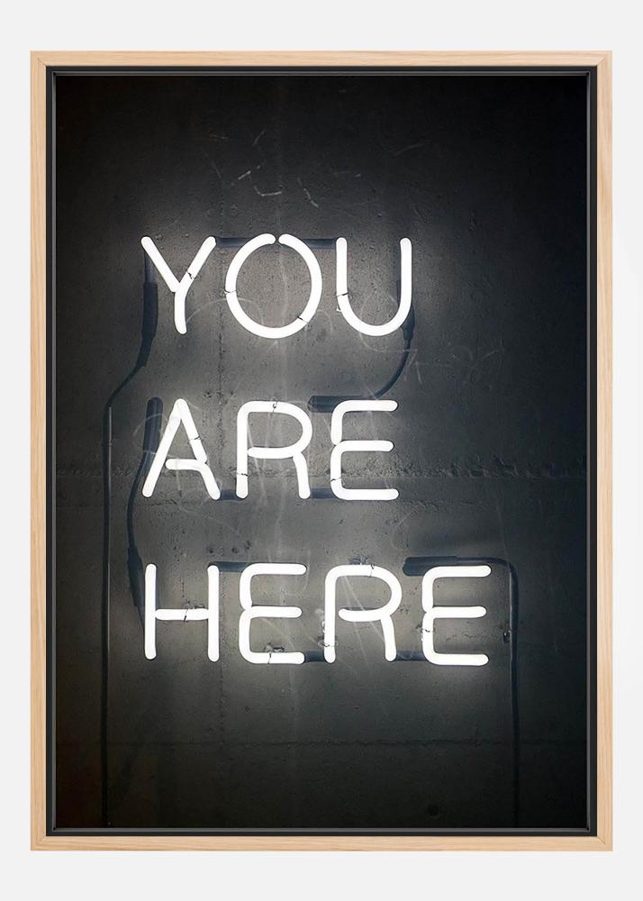Mustvalge tekstiposter neoonmärgiga, millel on informatiivne tekst "You are here". Lihtne ja stiilne pilt hubases humoorikas stiilis, täiuslik kombineerimiseks teiste suurepäraste motiividega suurel pildiseinal.