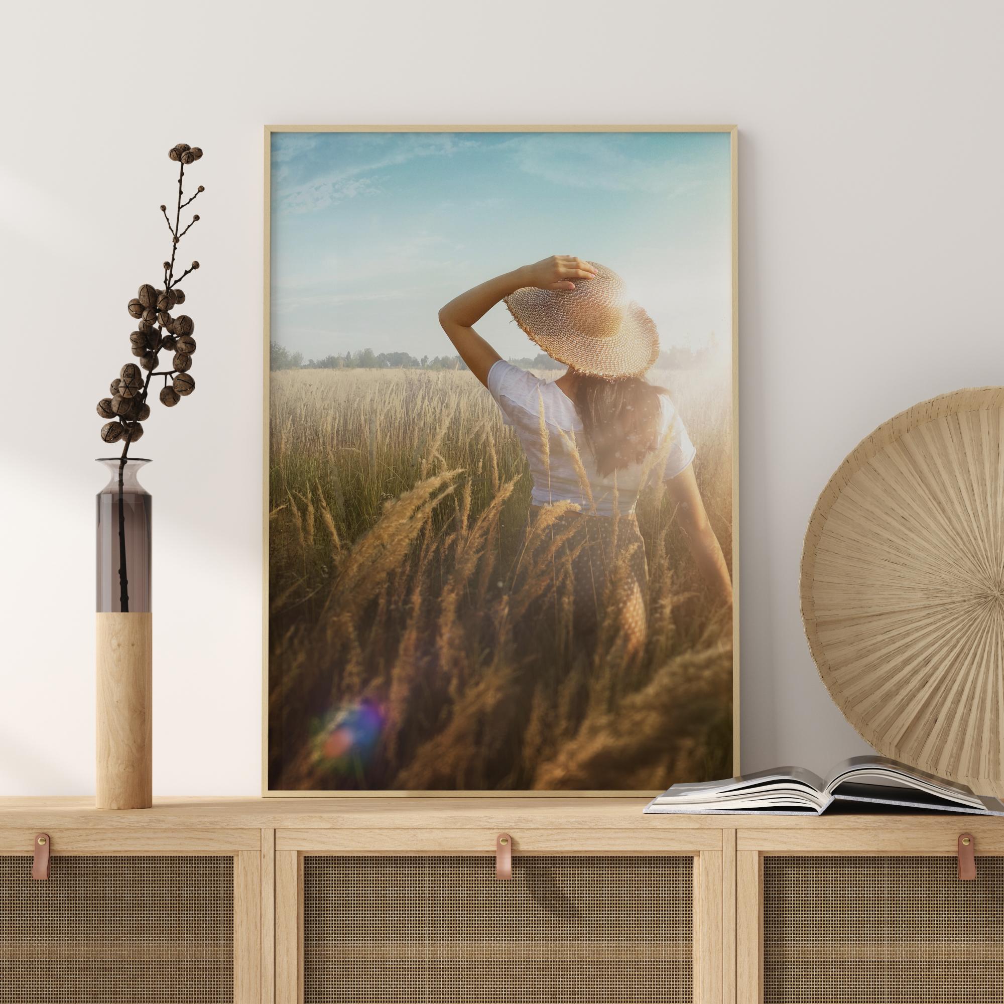 Lõõgastav ja värske trükis naisest õlgkübaraga nisupõldudel. Kaunis sinine taevas kohtub kuldse nisupõlluga. Käsi peas jalutab noor naine põldude vahel ja naudib värsket õhku. Täiuslik poster kõigile, kes hindavad looduse ilu.