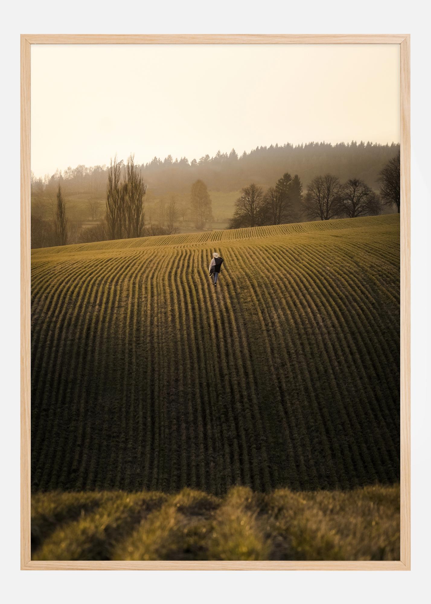 See plakat püüab maapiirkonna idülli olemust hetkes, mis on täis rahu ja lihtsust. Üksik kuju kõnnib mööda põlluväljade sümmeetrilisi jooni, olles ümbritsetud pehme kuldse tunni ajal, kui päikeseloojang heidab oma sooja valguse üle maastiku. See pilt pakub mõtisklust elu rütmi ja looduse muutliku ilu üle ning kutsub vaatajat kaasas käima vaiksel jalutuskäigul läbi põllu.