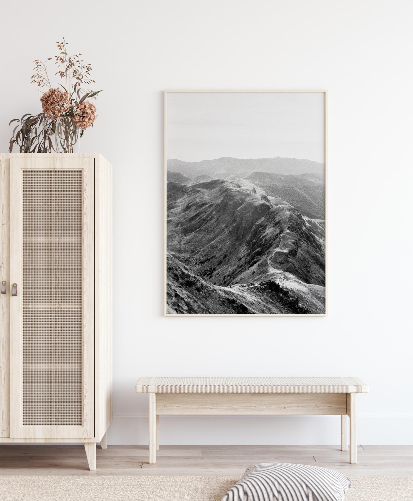 Mustvalge plakat mäeahelikuga. Erinevad halli toonid sulanduvad kõik ideaalselt üksteisesse. Ilma taimestiku või elu märkideta on mäetippudel vaikust peaaegu kuulda. Riputa see trükk värvikirevale seinale ja kuula tuule kohinat.