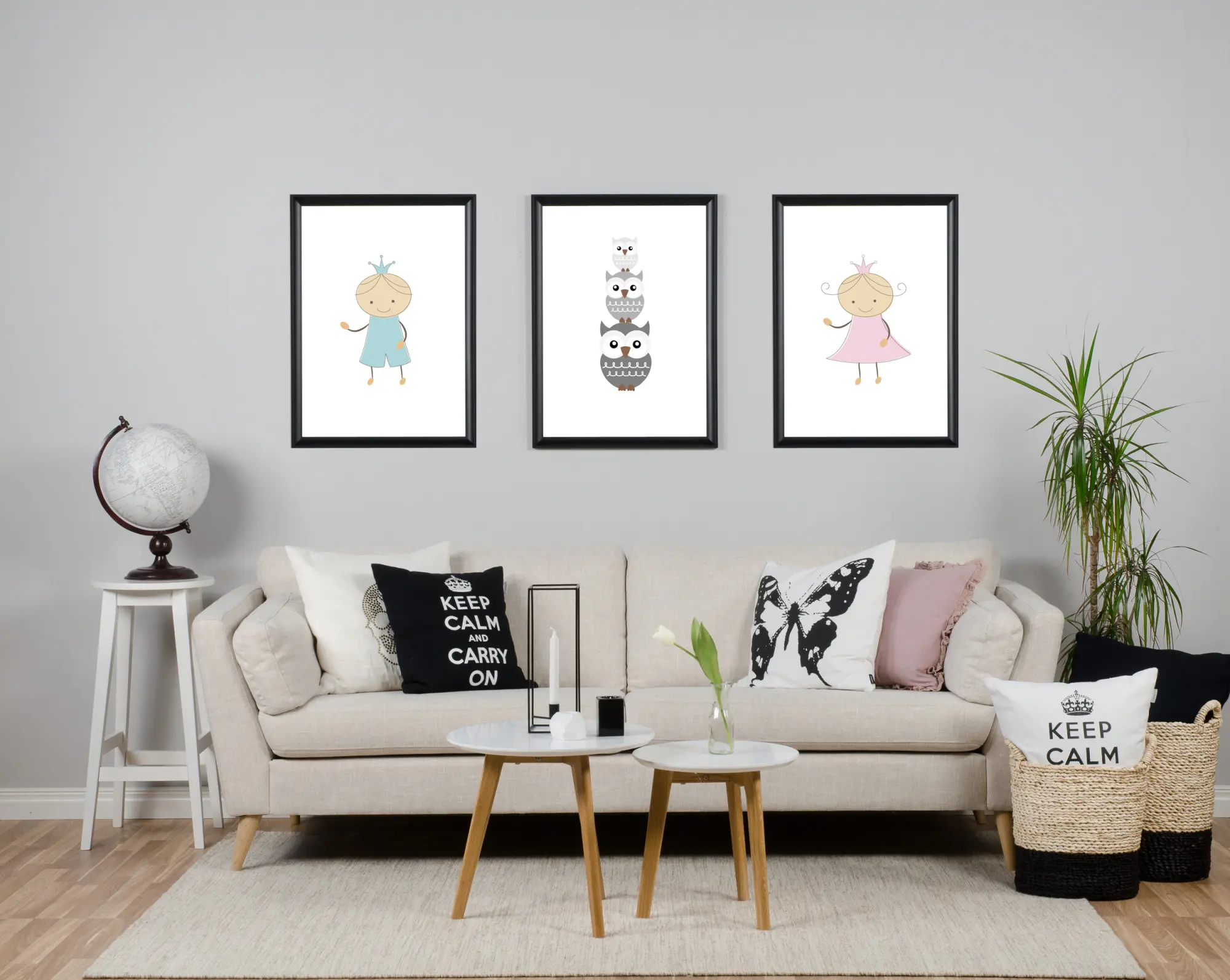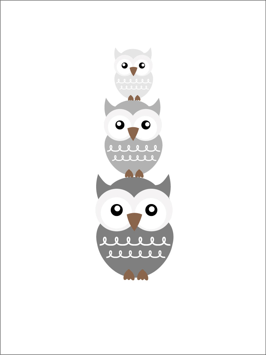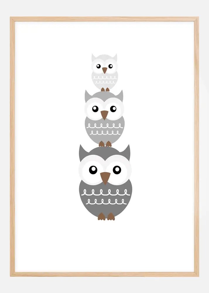 Kolm on parem kui üks. Seinakunst trendikaima linnuga, öökulliga. Illustratsioon kolmest stiliseeritud hallist öökullist, mis on üksteise peale virnastatud valgel taustal, on muutunud moodsa aja klassikuks. Motiiv sobib nii elutuppa kui ka lastetuppa ning avaldab eriti head muljet sisustusega, mis toob esile pildi värvid. Kombineeri teiste lindude või loomadega, et saada metsik tunne.