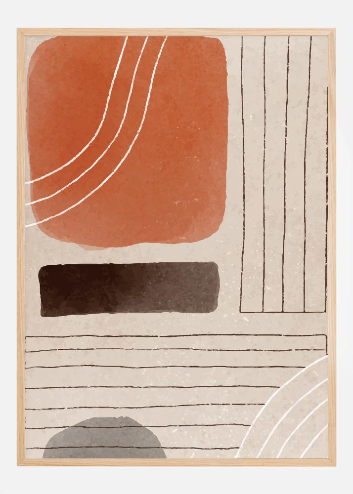 Selles kunstipärases plakatil mängitakse abstraktsiooni ja geomeetriaga, tekitades sügavamat peegelduse tunnet. Motiivis on suur, täidlane terrakota ruut, mis ankurdab kujundust, ümbritsetud valgete kumerate joontest, mis jätavad liikumise ja pehmuse mulje. See soe, maatooni värv loob kohese soojuse ja kutsuva tunde.