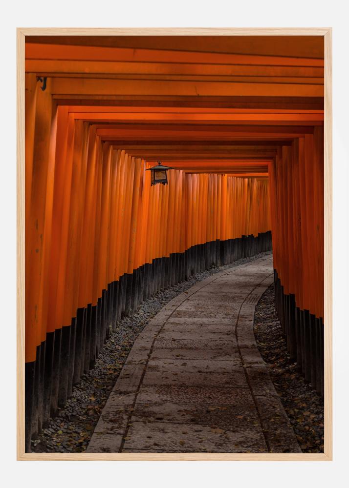 Plakat kiviteega, mida ääristavad oranzid ja mustad puidust toed. Tee keskel ripub rauast latern. Looduslik valgus paistab teele, kuhu on langenud mõned väikesed sügislehed. Kaunis trükk, mis võib elavdada ükskõik millist seina.
