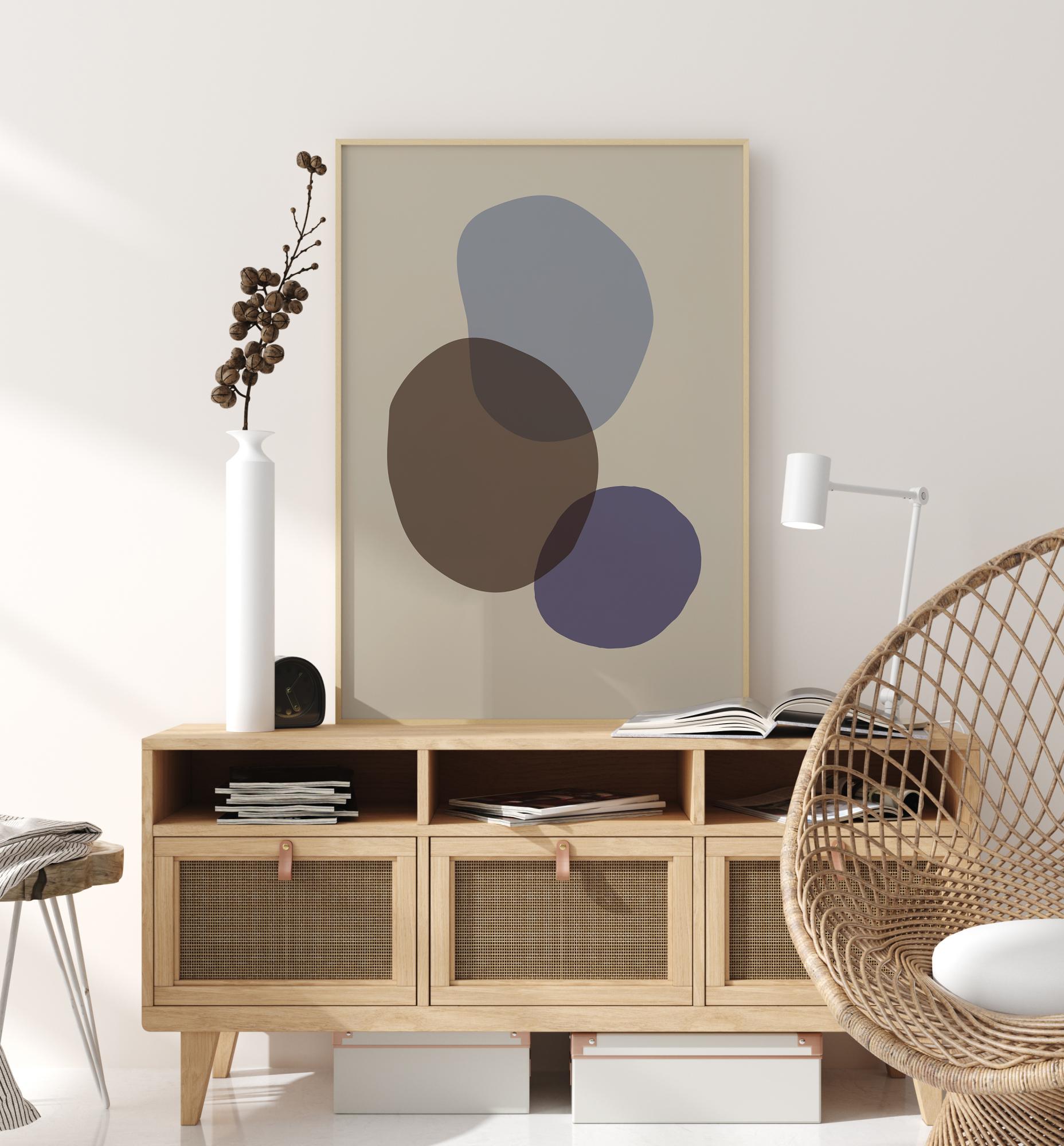 Fantaasiarikas poster kolme erinevat värvitooni moodustisega. Kreemjas valgel taustal kattuvad pruunid, hallid ja lillad kujundid üksteisega. Pruun kuju domineerib väiksemaid lillasid ja halle kujundeid. Lihtne trükk, mida oma kodus üles riputada. Kasuta oma kujutlusvõimet, et näha, mida kujundid kujutavad.