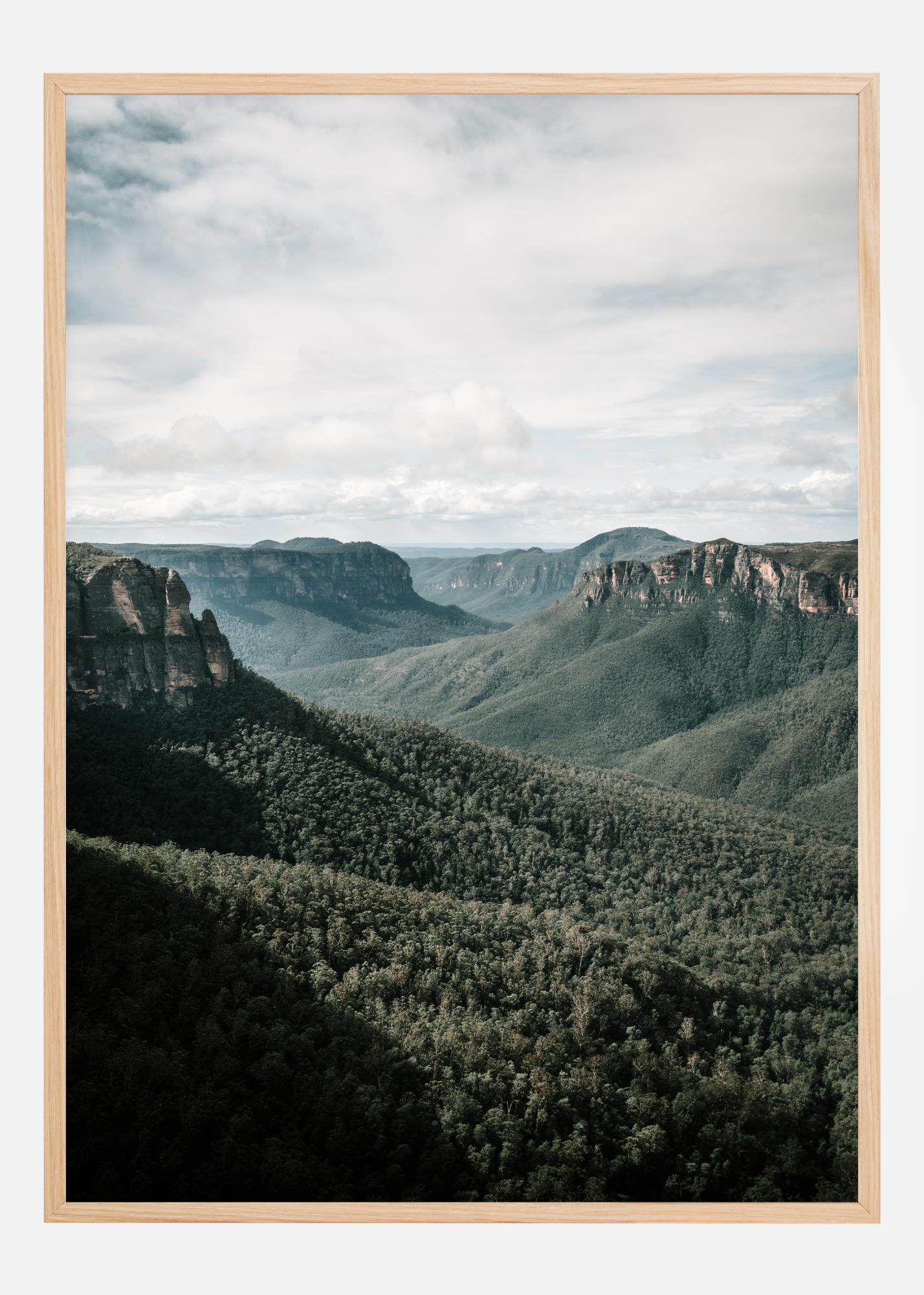 Avaradest maastikest hingemattev vaade. Tihe taimkate katab maastiku alates orgudest kuni kaljuste tippudeni. Pilves taevas rõhutab küngaste pehmeid rohelisi toone ja loob rahuliku atmosfääri. Looduse armastajatele on see ideaalne plakat kodus ülesriputamiseks.
