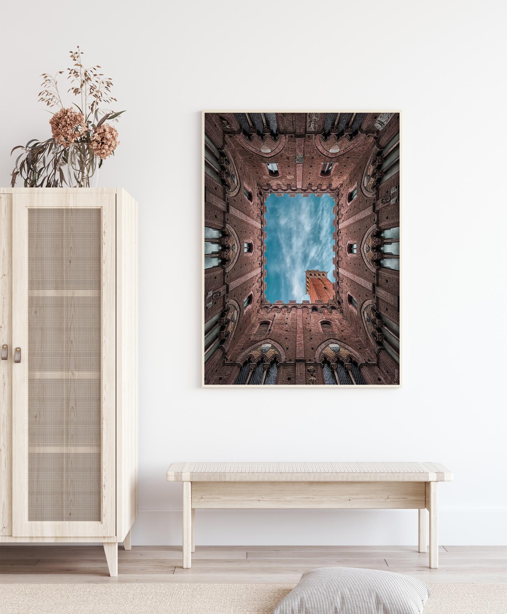 Perspektiivplakat, alt ja üles, Palazzo Pubblico Sienas, Itaalias. Selgelt särava helesinise taeva taustal paistavad selgelt välja hoone kummalgi küljel asuvad gooti aknad. Kui vaatate üles taeva poole, võite märgata suurepärast kellatorni. Tooge oma koju veidi Itaalia arhitektuuri selle suurepärase trükise abil.