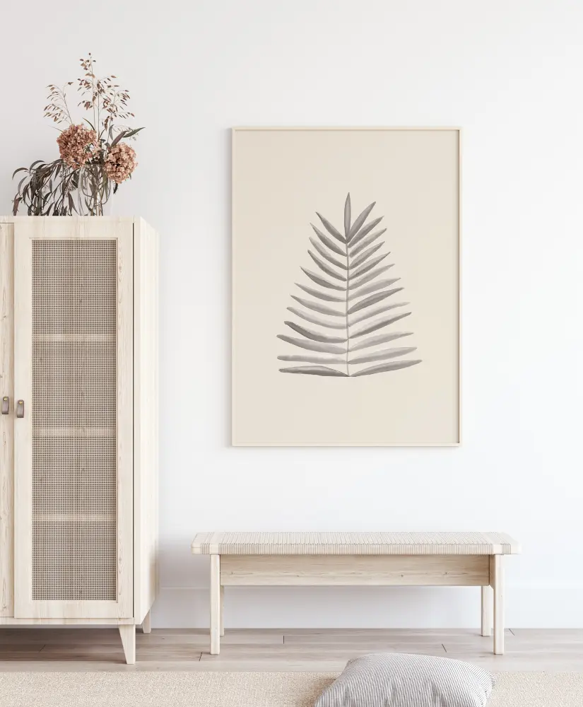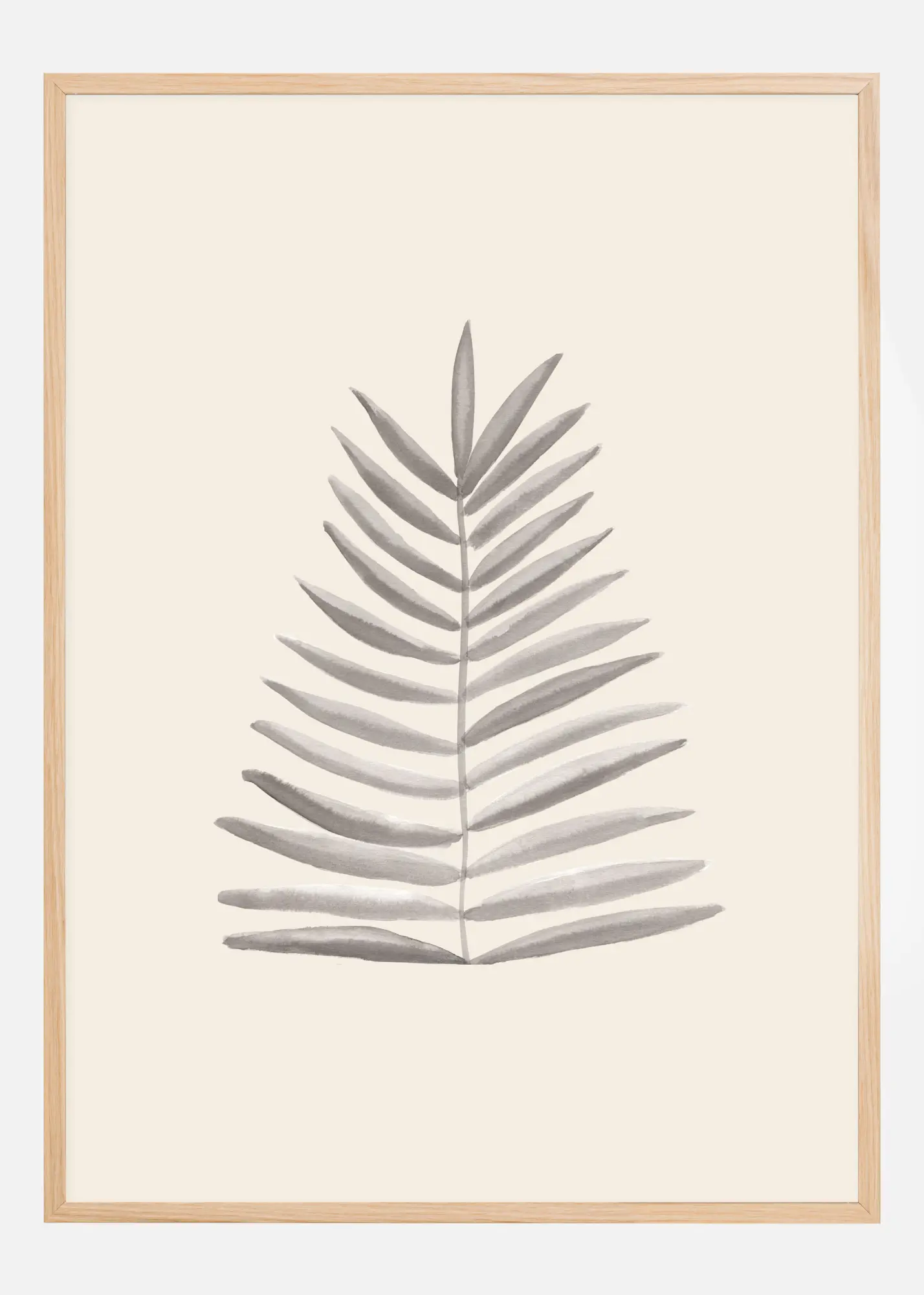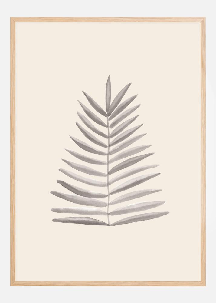Lihtne, kuid selge poster palmilehega. Kreemvalgel taustal seisab leht püsti oma varrel. Kreemvalge taust rõhutab väikest pruuni palmilehte. Lisa see annus klassi värvilisele seinale.