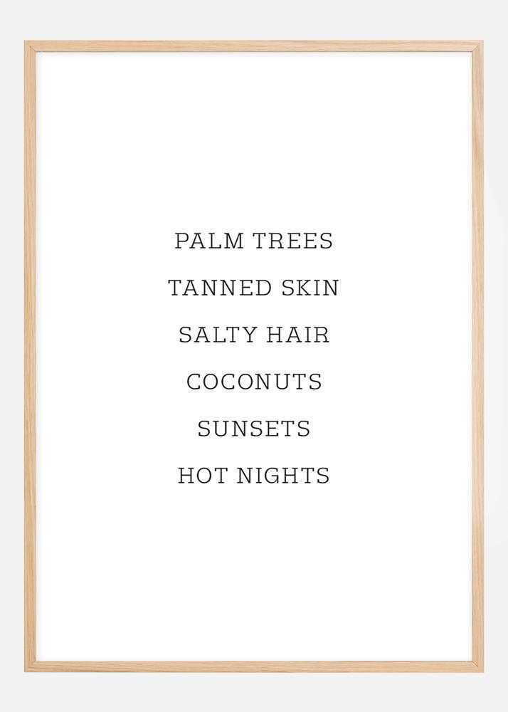 Passiivne poster, mis edastab sõnumit suvise tundega. Musta kirjastiiliga valgel pinnal on sõnad: PALMID, PÄEVITATUD NAHK, SOOLANE JUUKSED, KÕRVITSAD, PÄIKESELOOJANGUD, SOOJAD ÖÖD. Keskse paigutusega sõnad meenutavad meile suvehooaega. Lisa oma moodsasse elutuppa suvine puudutus selle trükise abil.