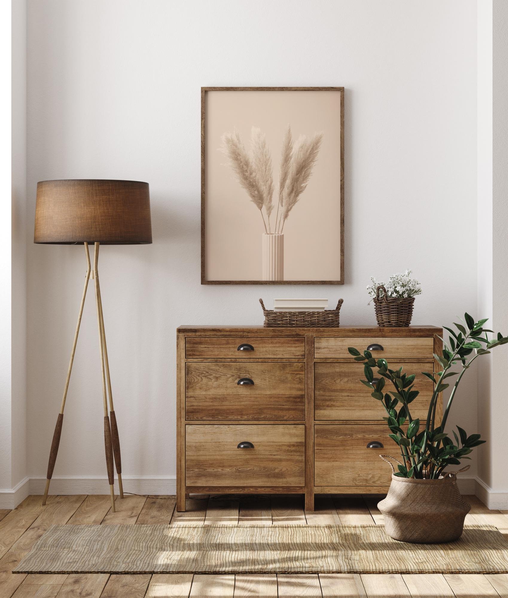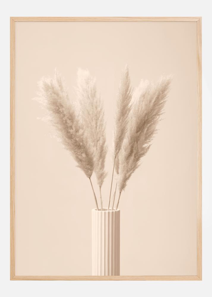Lilleline plakat, kus on vaasis pampashein. Rohepead paistavad välja roosa seepiatausta taustal, andes pehmuse tunde, kus vaas on kõva. See pilt lisab kodule elegantsi.