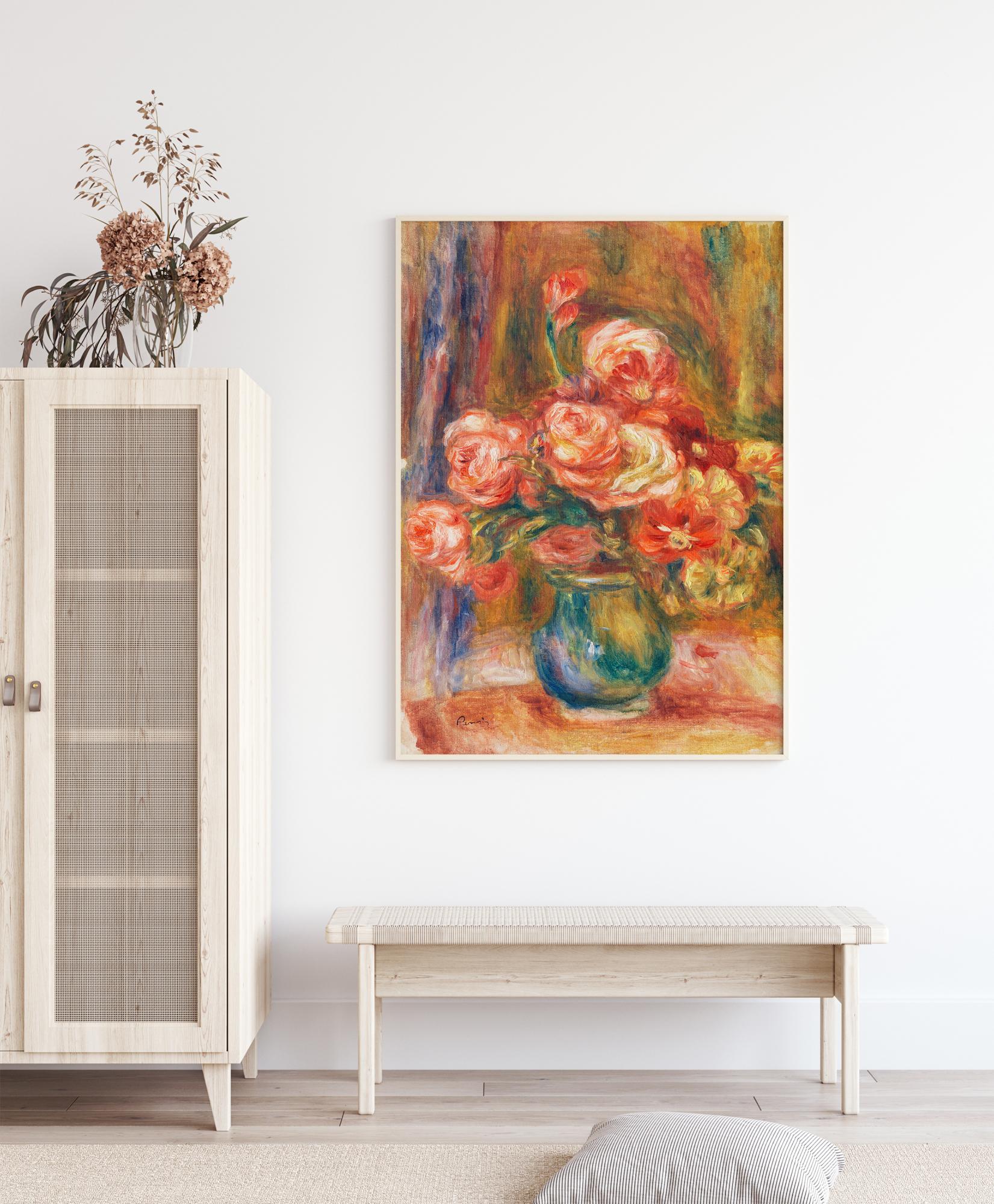 Kaunis käsitsi maalitud roosikimp. See imeline oranžide ja punaste rooside trükk rohelises ja värvilises vaasis loob sooja ja rahustava tunde. Värvikombinatsioon mitmevärvilisel taustal sulab kõik ideaalselt üksteisesse. Tee oma kodu säravaks selle imelise postri abil.