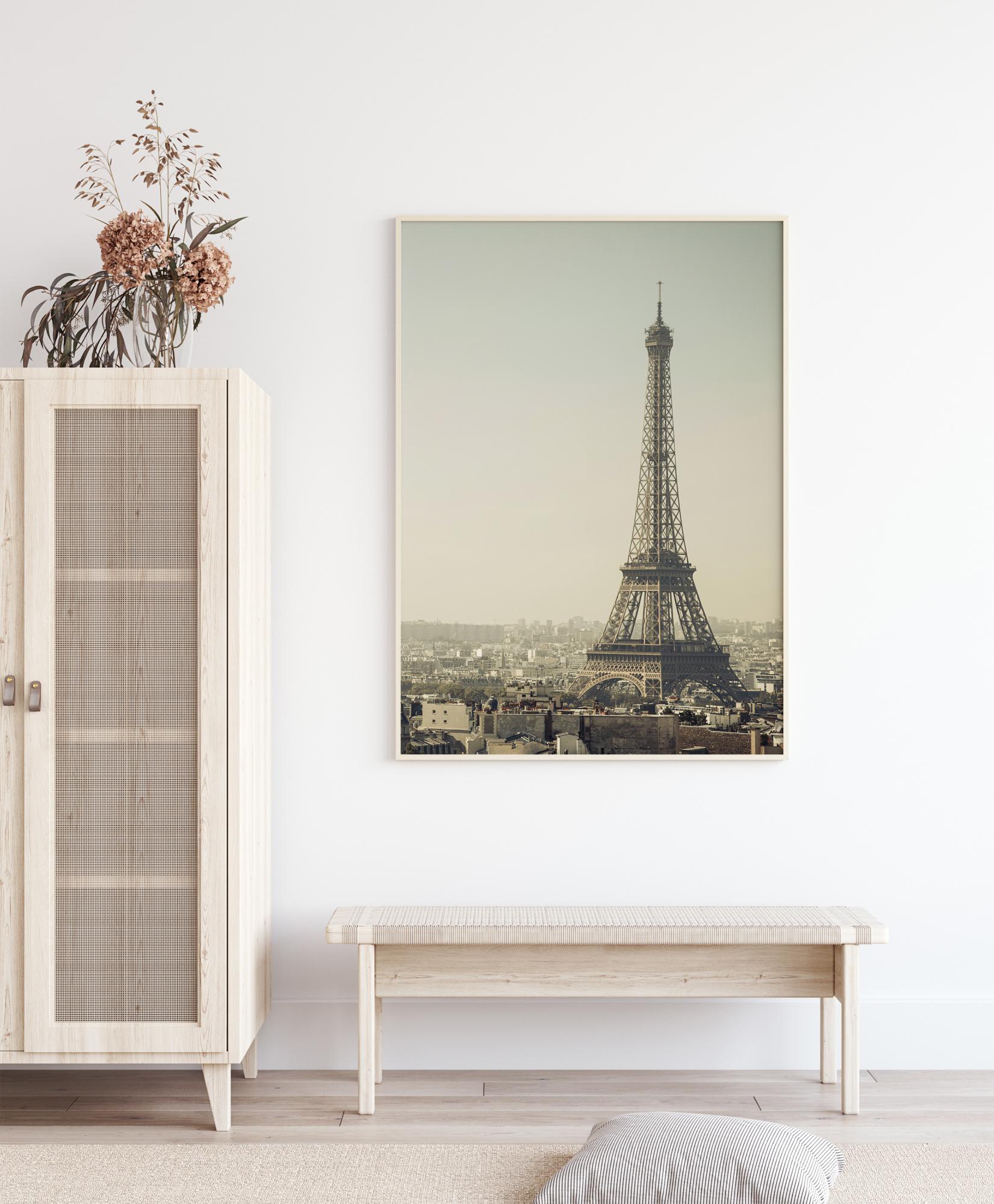 Silmipaistev plakat Eiffeli torniga. Pilvine taevas rõhutab selle silmapaistva arhitektuurilise konstruktsiooni ilu. Ümbritsevad hooned sulanduvad ideaalselt selle prindi mustvalge disainiga. Kujutage ette vaadet selle hoone tipust, kui riputate selle prindi oma koju.