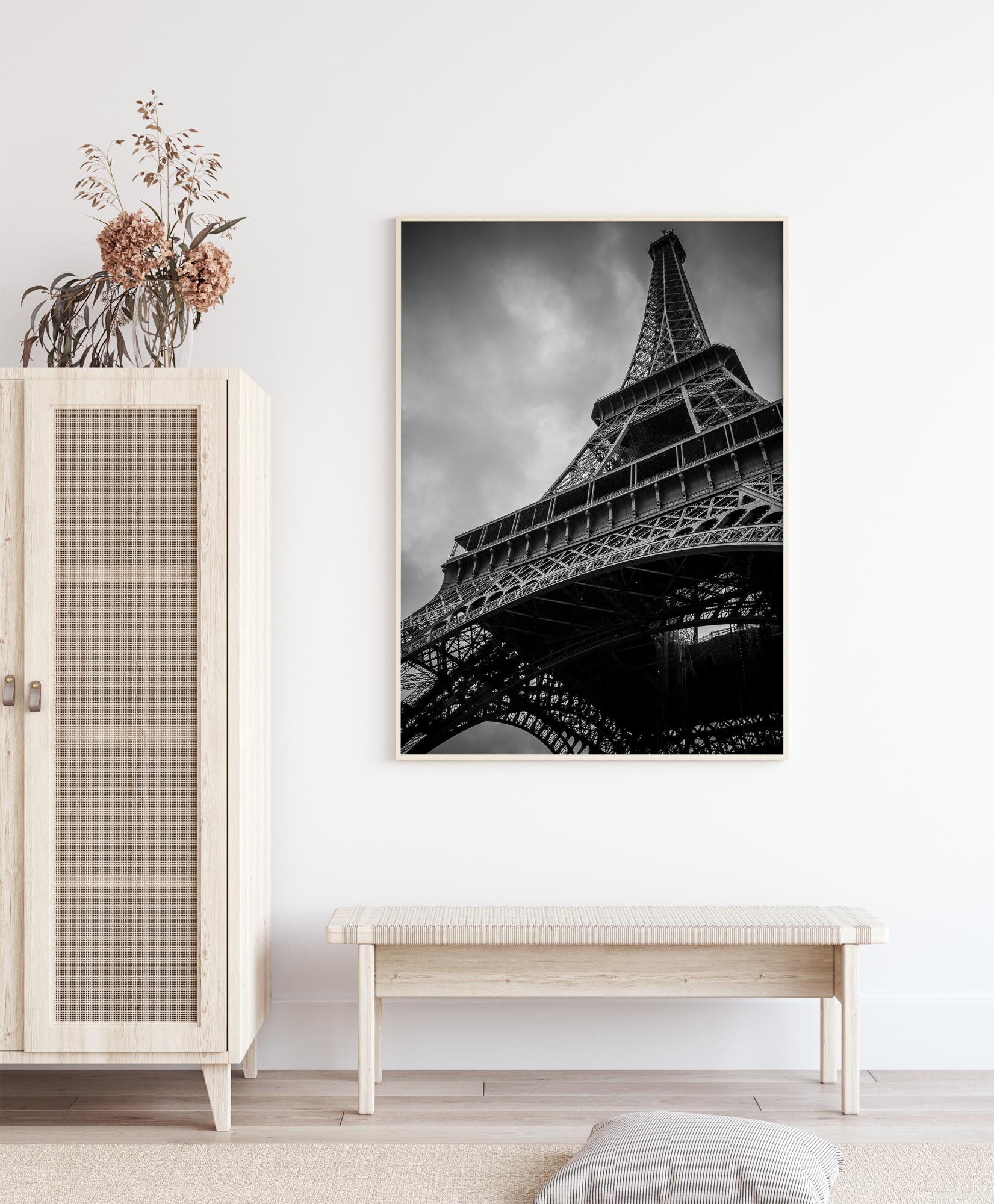 Allavaateline vaade hingematvalt Eiffeli tornilt. Selle pilvise halli taeva taustal näitab see ilus rauastruktuur oma püramiidilaadset kuju, kui see kõrgele tõuseb. Kõigile, kes armastavad Pariisi, on see täiuslik kingitus.