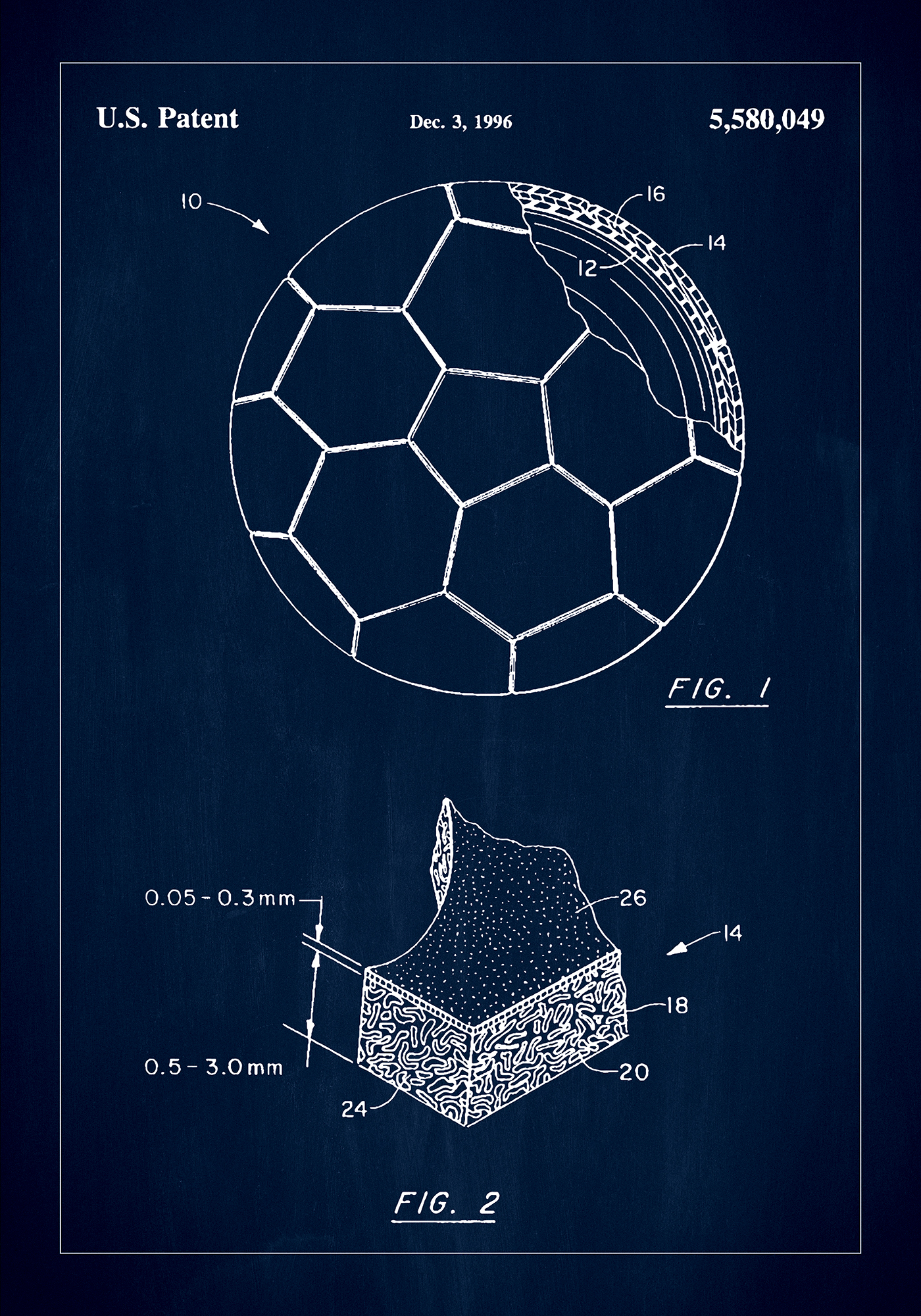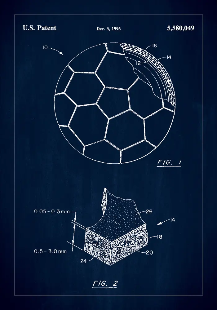 See elegantne patendi plakat kujutab täpset kunstilist esitlust U.S. Patendist 5,580,049, mis registreeriti ametlikult 3. detsembril 1996. Plakat on ideaalne segu tehnoloogiast ja kunstist ning selle monokroomne stiil teeb sellest ajatult ilusa sisustuselemendi. See esitleb patendijoonist jalgpallist kahes kujus: esimeses kuvas on näha palli üldine disain, samas kui teine osa pakub üksikasjalikku vaadet lõikest palli pinnast, rõhutades aluseks olevat struktuuri ja mõõtmeid.