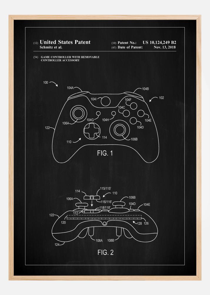 See patendiposter musta tahvli taustal esitleb elegantselt kaasaegset Xboxi mängukontrollerit eemaldatava lisaseadmega, patendinumber US 10,124,249 B2, kuupäevaga 13. november 2018. Täiustatud disain ja selle komponendid on visuaalselt detailselt esitatud, pakkudes ülevaadet, kuidas tehnoloogiat ja mängukogemust saab kasutaja jaoks kohandada. See on pideva innovatsiooni väljendus mängukontrolleri maailmas.