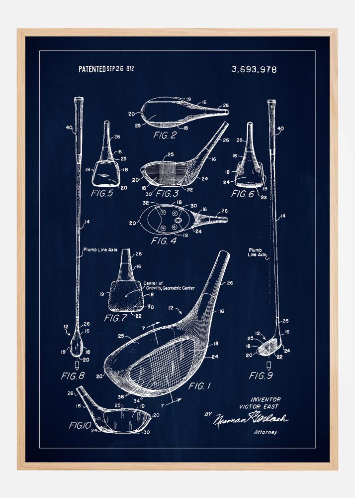 See stiilne patendiplakat esitleb hoolikalt detailset illustratsiooni golfiklubi patendist, mis anti 26. septembril 1972, patendinumbriga 3,693,978. Disaini iga aspekt on esile toodud läbi mitmete läbimõeldud figuuride, täispikkadest lõigetest kuni detailsete ülevaadeteni klubi peast. See osavalt teostatud patendijoonis on austusavaldus spordi tehnoloogilisele arendusele ja valgustab leiutaja nutikust ja täpsust.