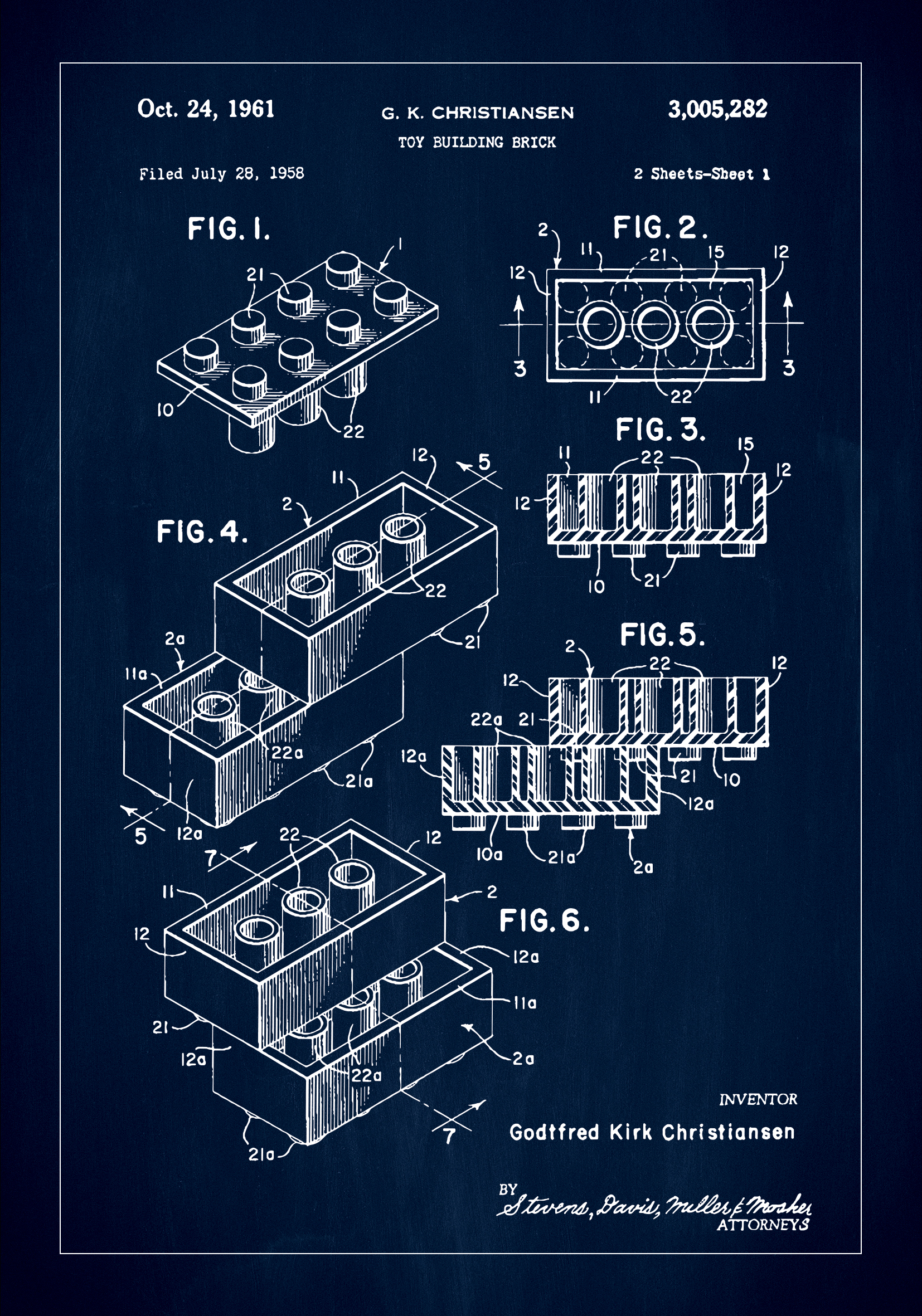 See detailirohke patentplakat kujutab Lego mänguklotse geniaalset disaini, mis muutis loomingulise mängu ja õppe viisi, loodud Godtfred Kirk Christianseni poolt. Patentinumber 3,005,282, antud 24. oktoobril 1961, jäädvustab see illustratsioon leiutise olemuse, mis on inspireerinud ja rõõmustanud põlvkondi ehitajaid ja mõtlejaid.