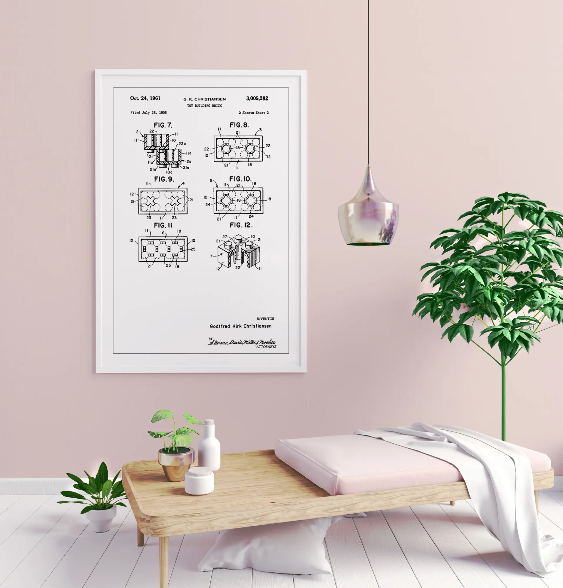 See patendiplakat kajastab tõelist revolutsiooni mängus ja loovuses. See näitab LEGO mänguklotsi patenti, mis anti välja 24. oktoobril 1961 numbriga 3,005,282 ja mille kujundas leiutaja Godtfred Kirk Christiansen. See on suurepärane austusavaldus lihtsale, kuid sügavalt mõjuvõimsale disainile, mis on viinud kokku ja inspireerinud lapsi ja täiskasvanuid üle kogu maailma ehitama ja looma.